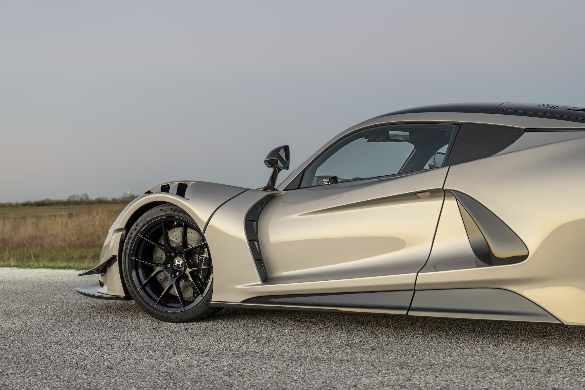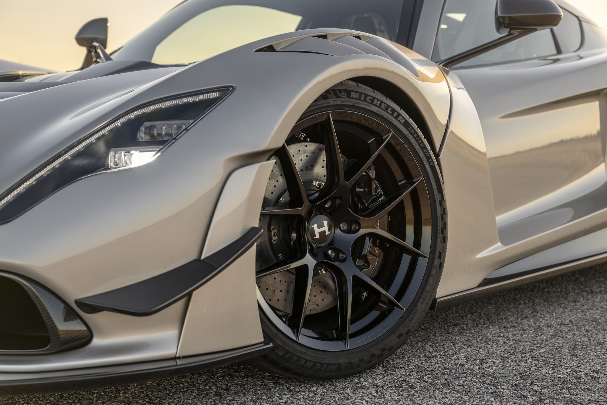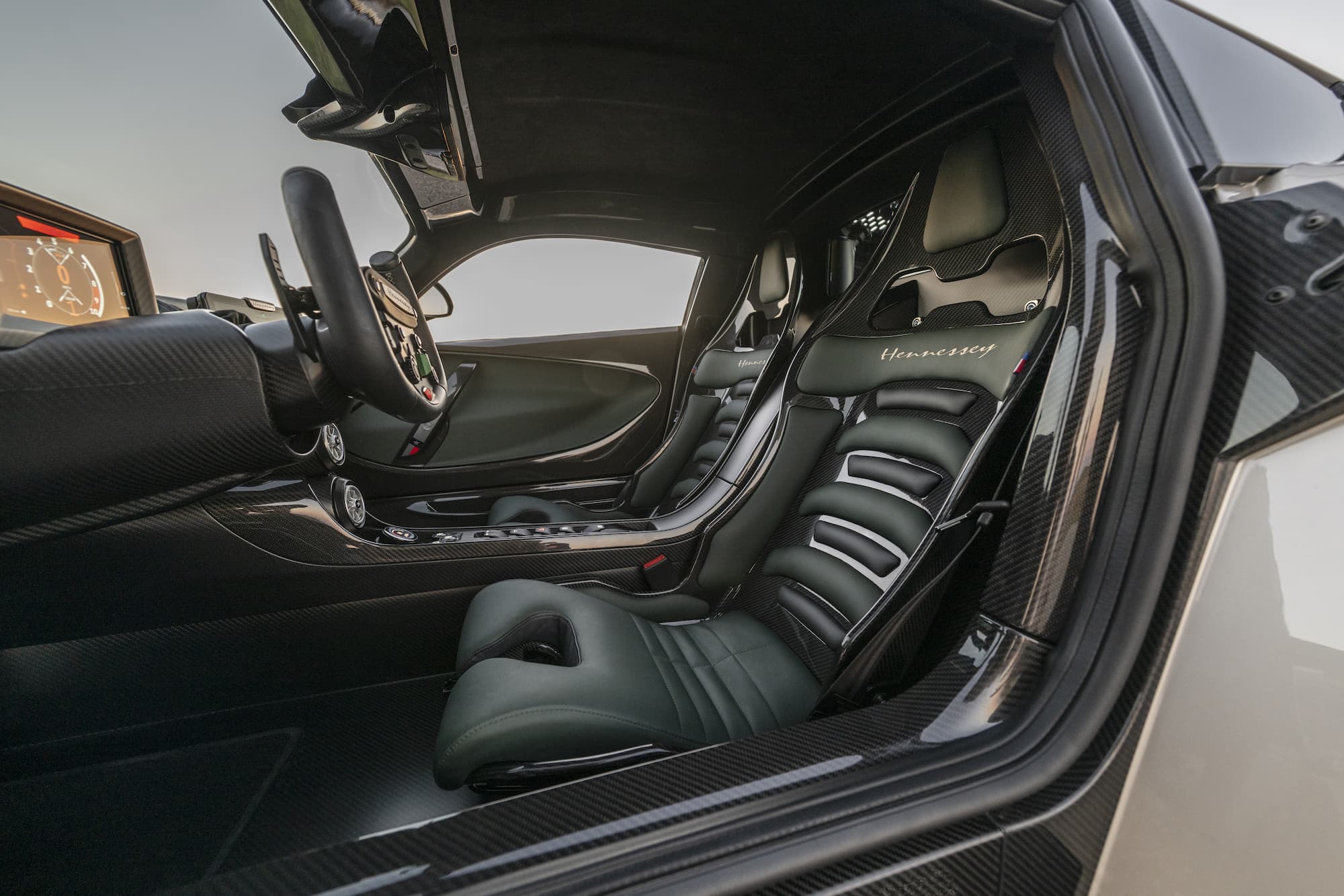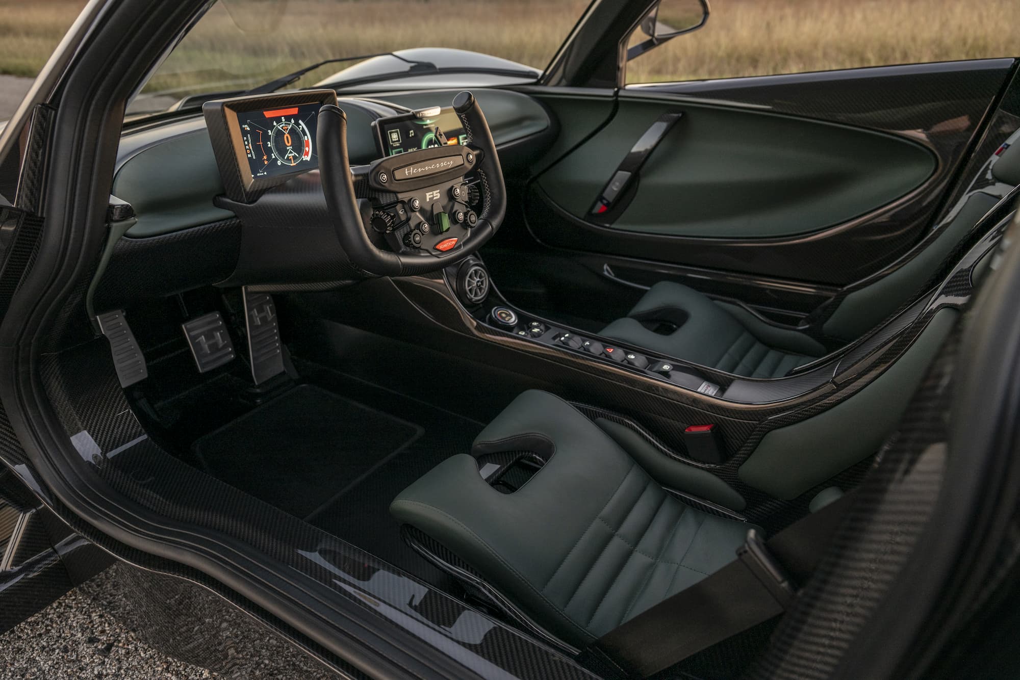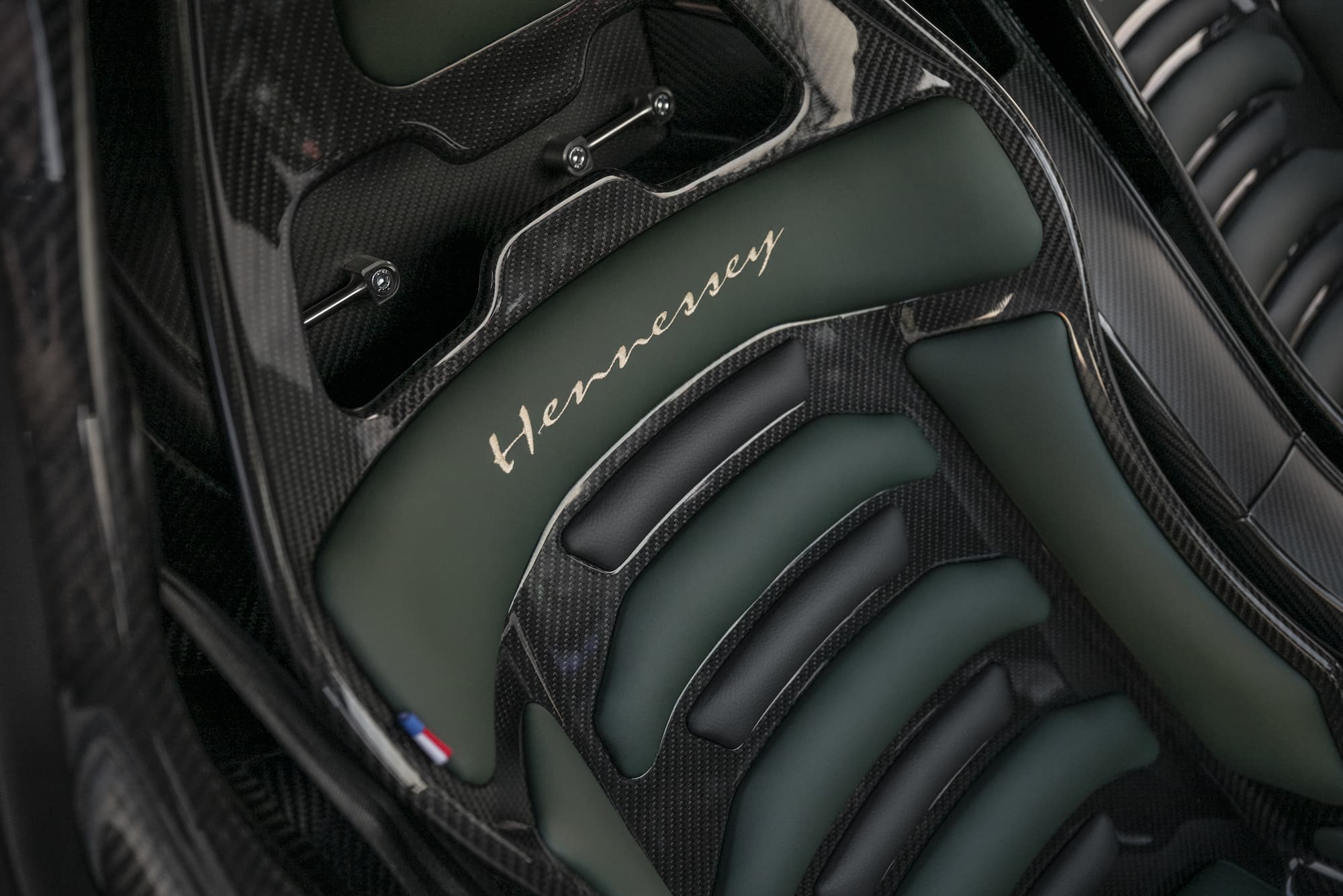 The bespoke Champagne Venom F5 coupe features a Gray exterior and Green-accented interior. This example of the F5 sports polished silver wheels and visible carbon fiber accents, and it has received the ‘Evolution’ upgrade.