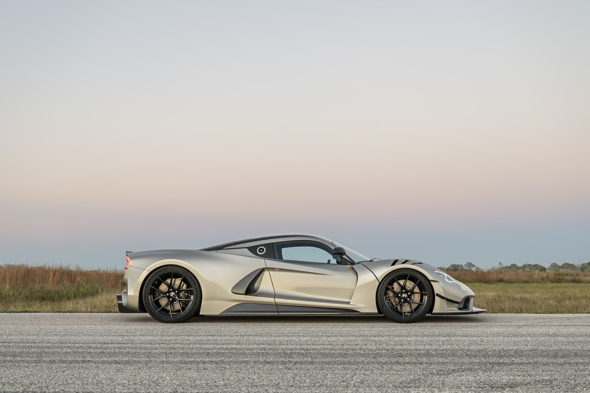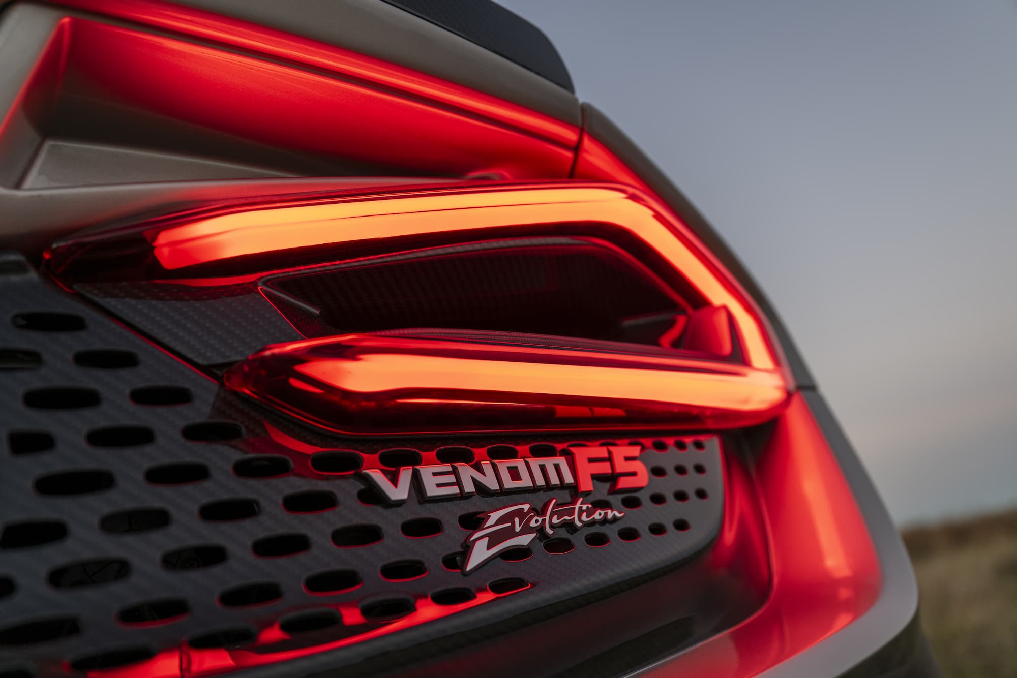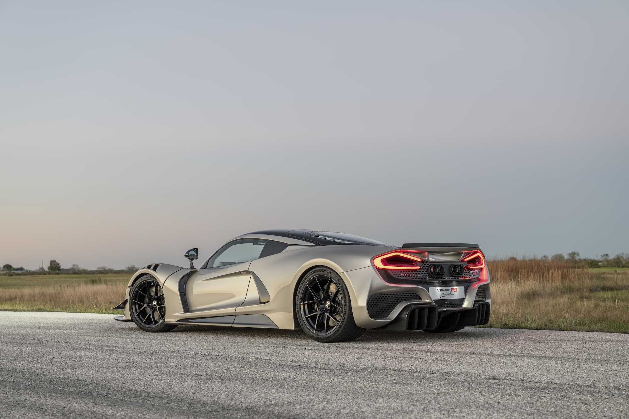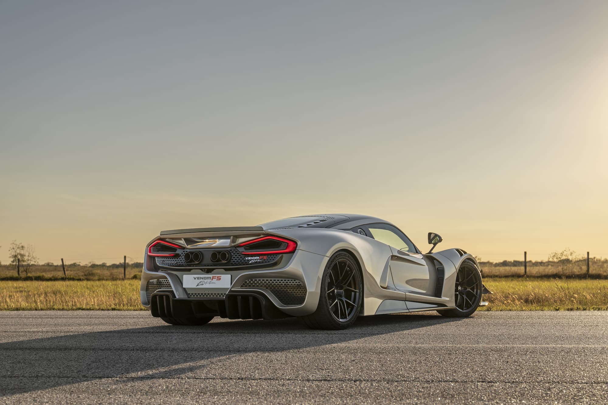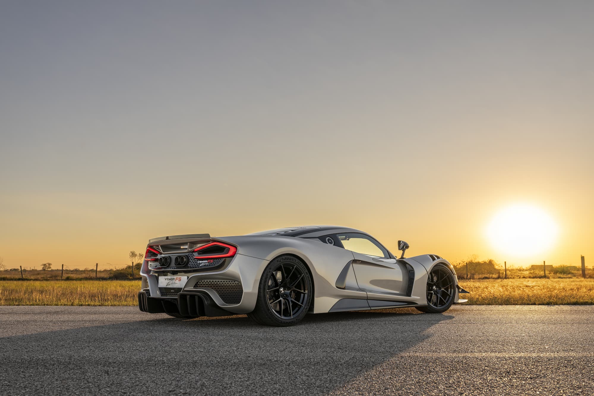 The bespoke Champagne Venom F5 coupe features a Gray exterior and Green-accented interior. This example of the F5 sports polished silver wheels and visible carbon fiber accents, and it has received the ‘Evolution’ upgrade.