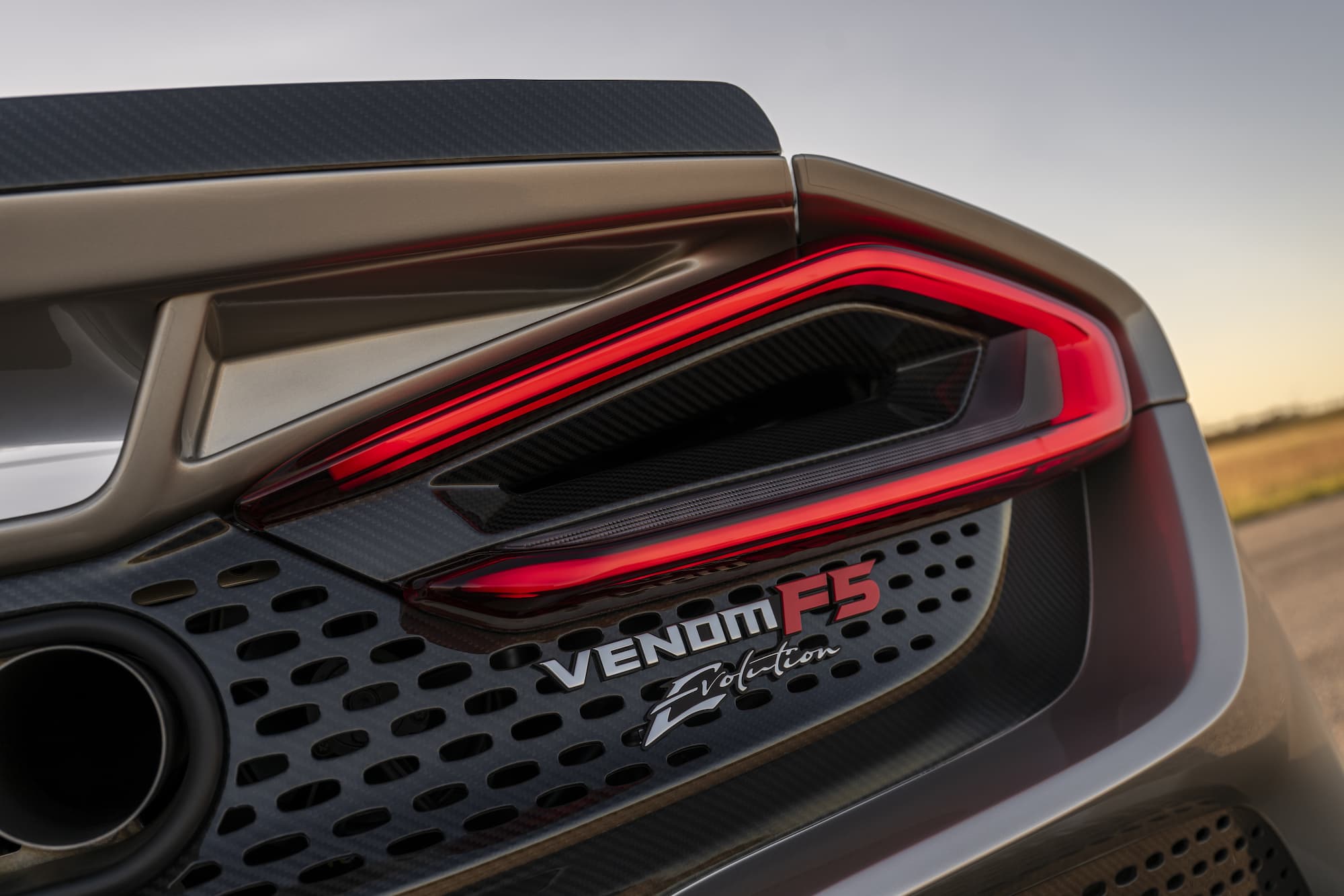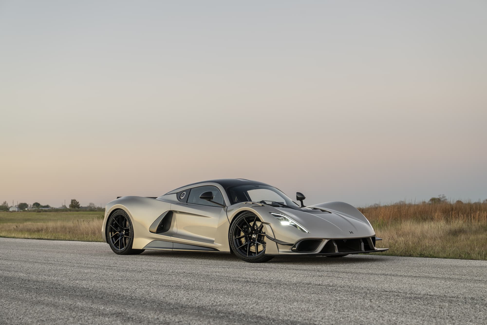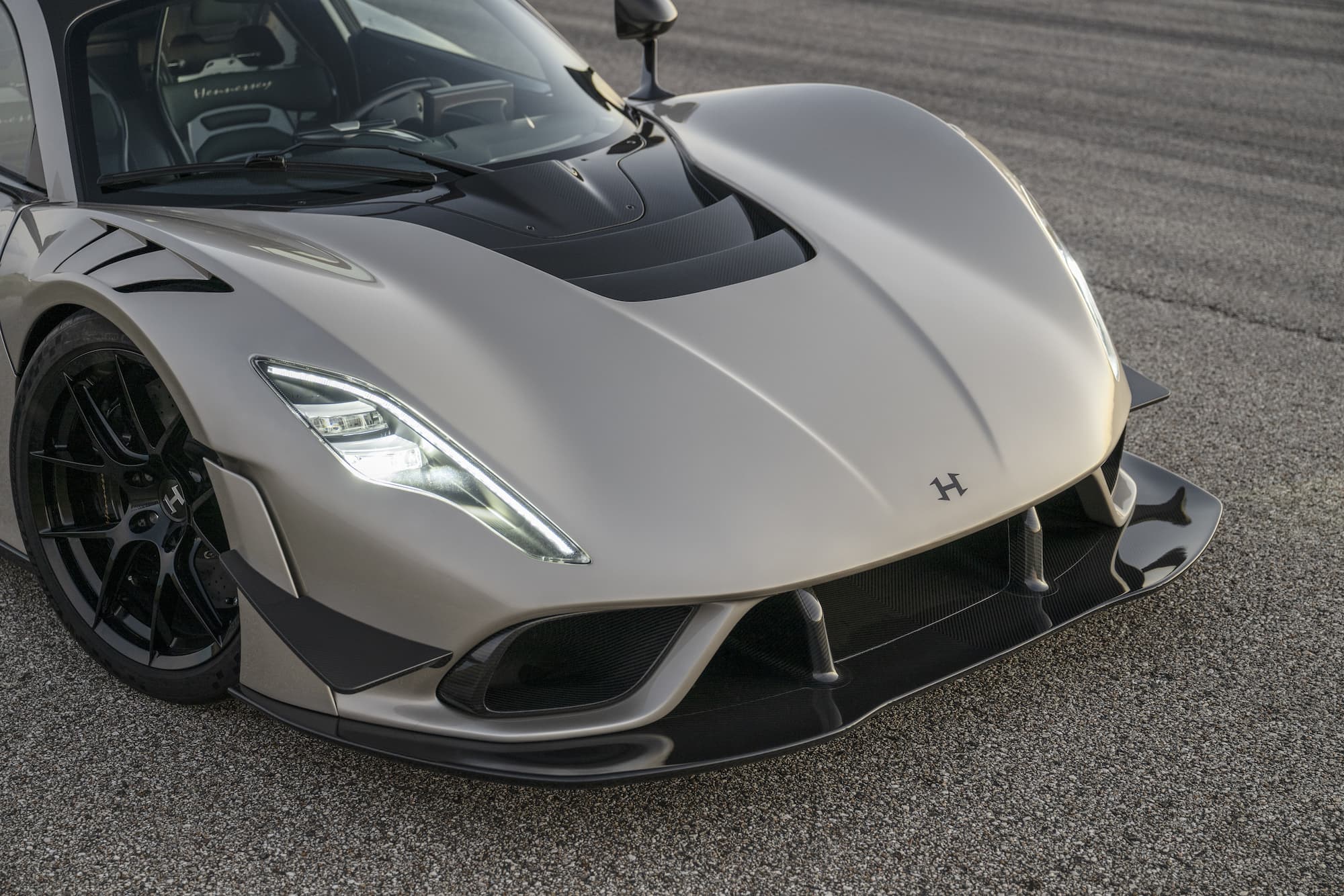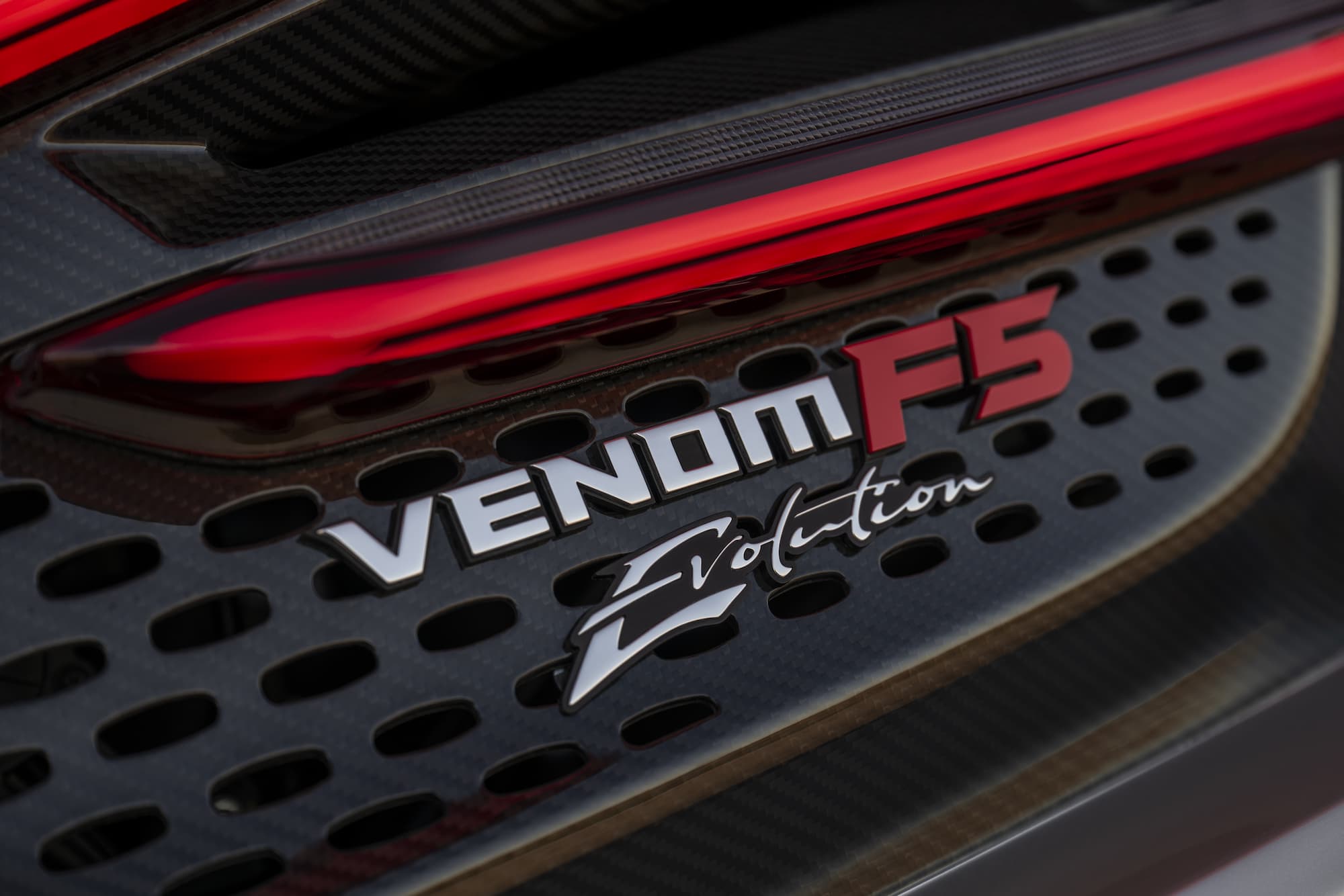 The bespoke Champagne Venom F5 coupe features a Gray exterior and Green-accented interior. This example of the F5 sports polished silver wheels and visible carbon fiber accents, and it has received the ‘Evolution’ upgrade.