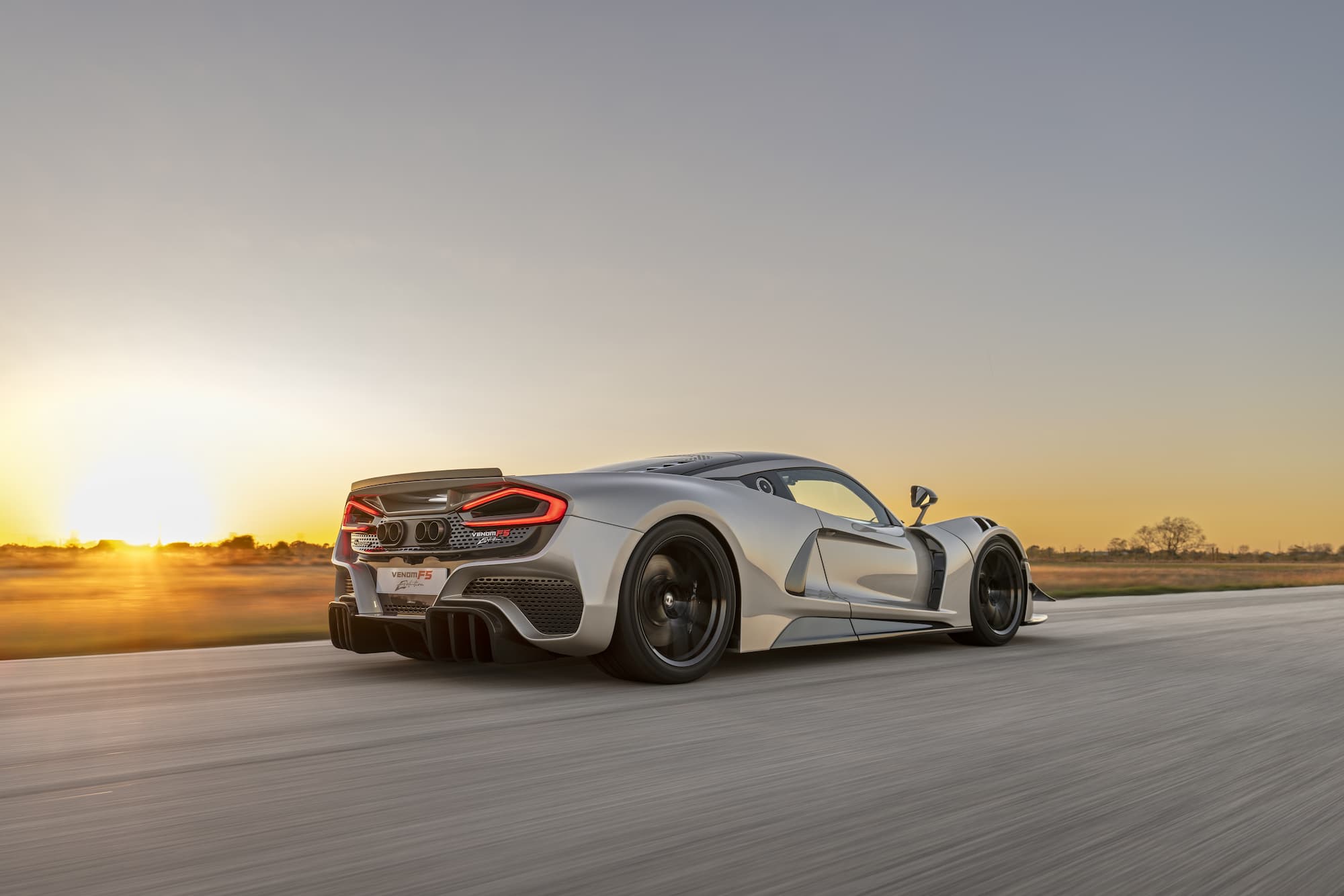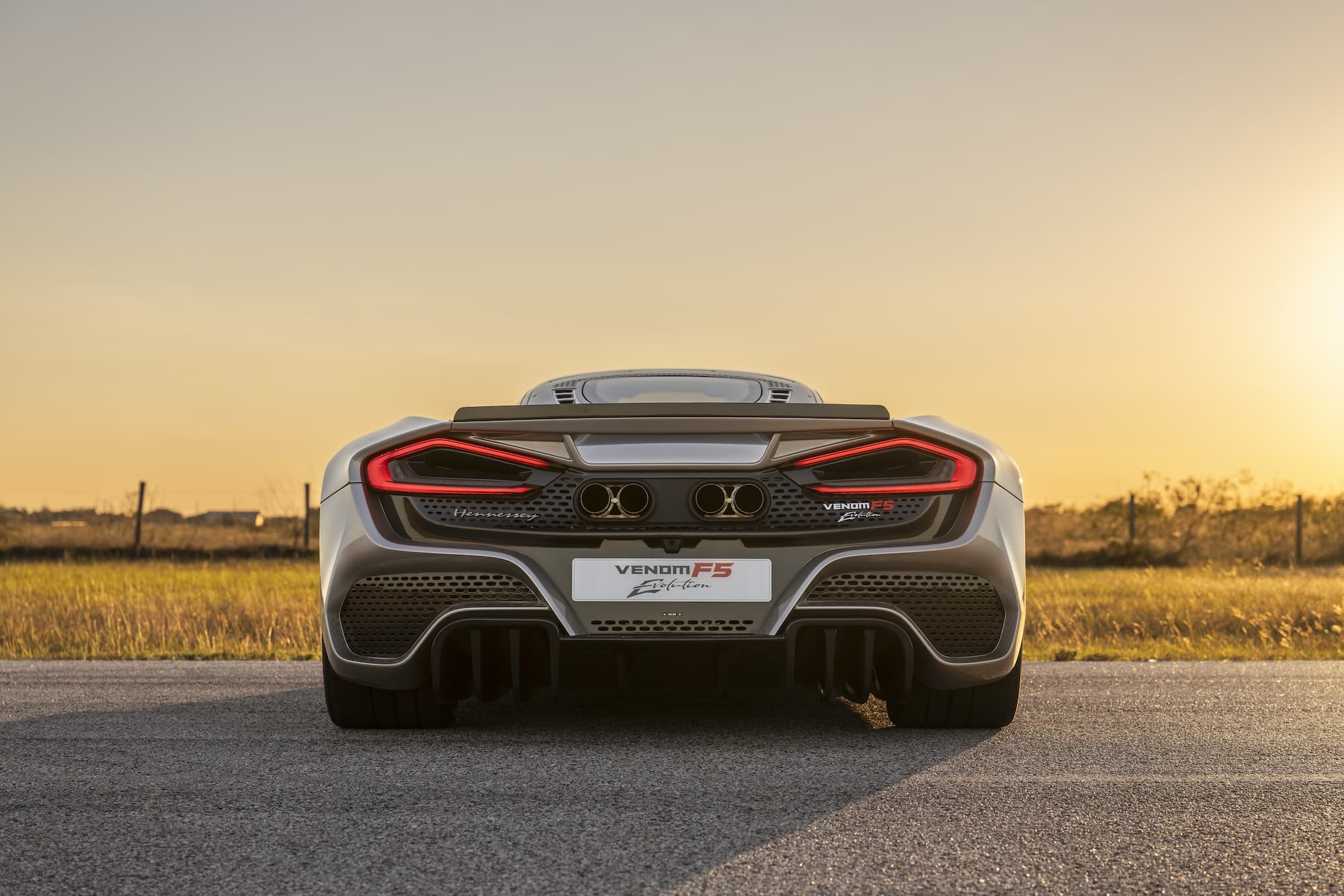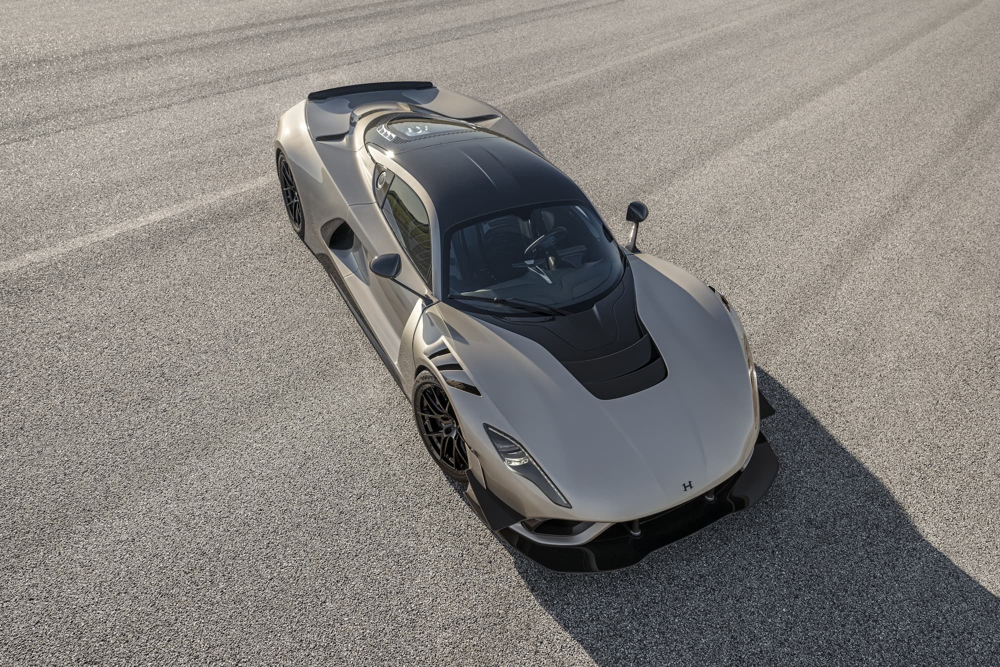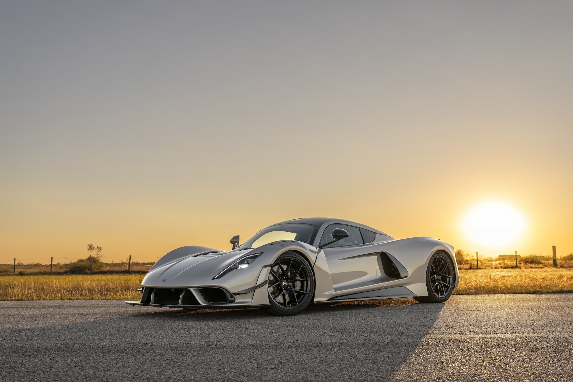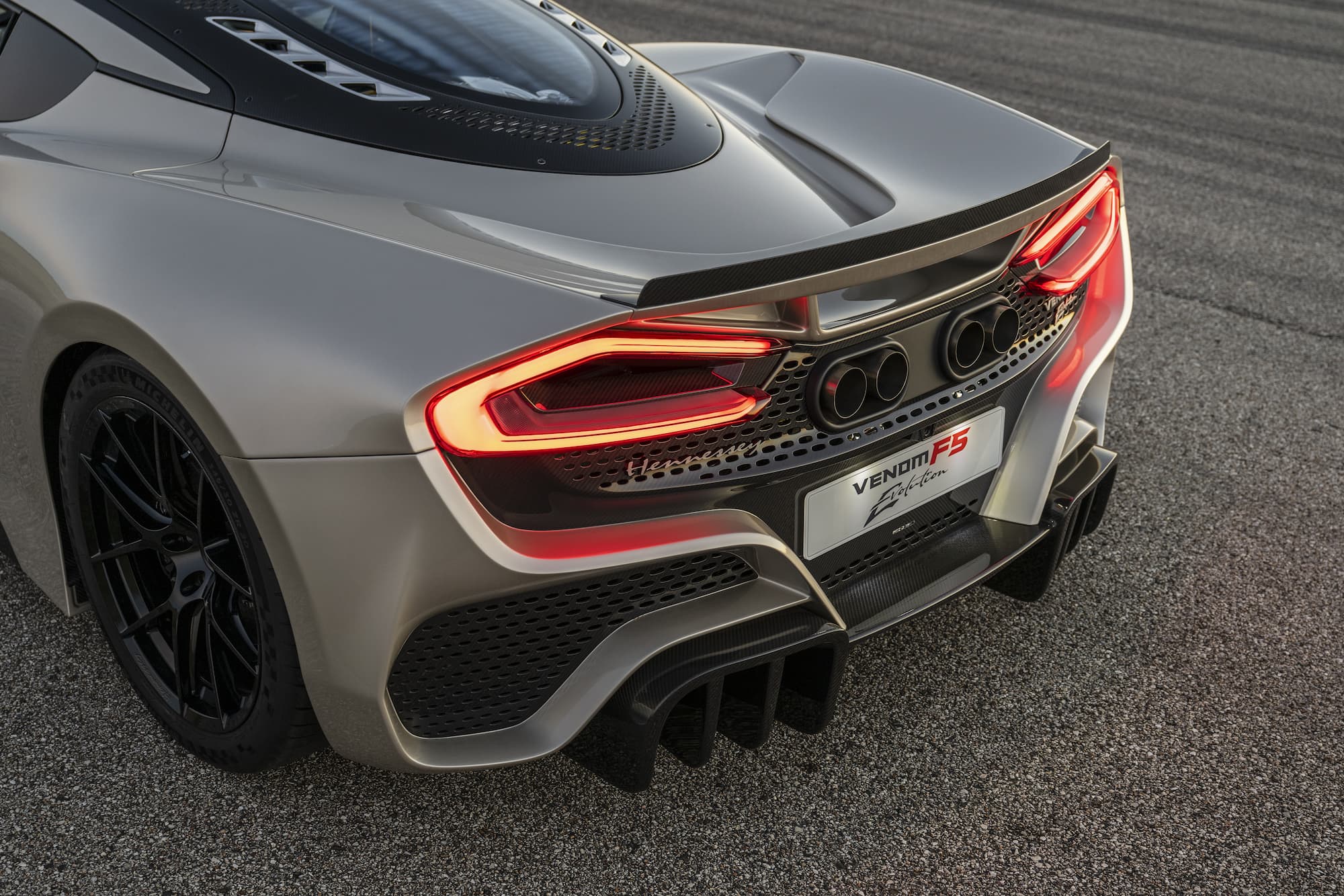The bespoke Champagne Venom F5 coupe features a Gray exterior and Green-accented interior. This example of the F5 sports polished silver wheels and visible carbon fiber accents, and it has received the ‘Evolution’ upgrade.