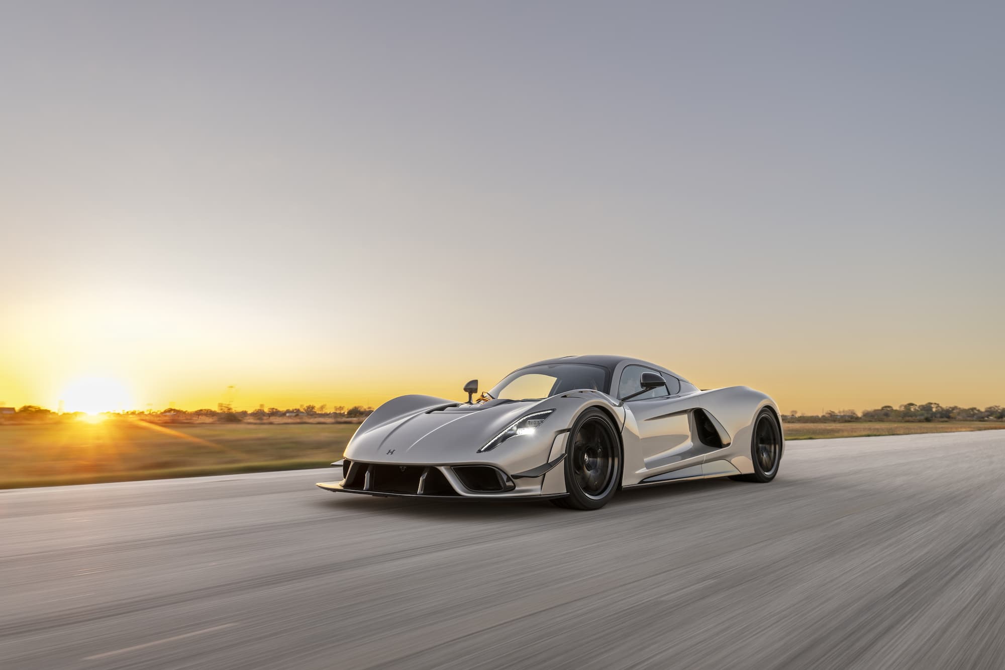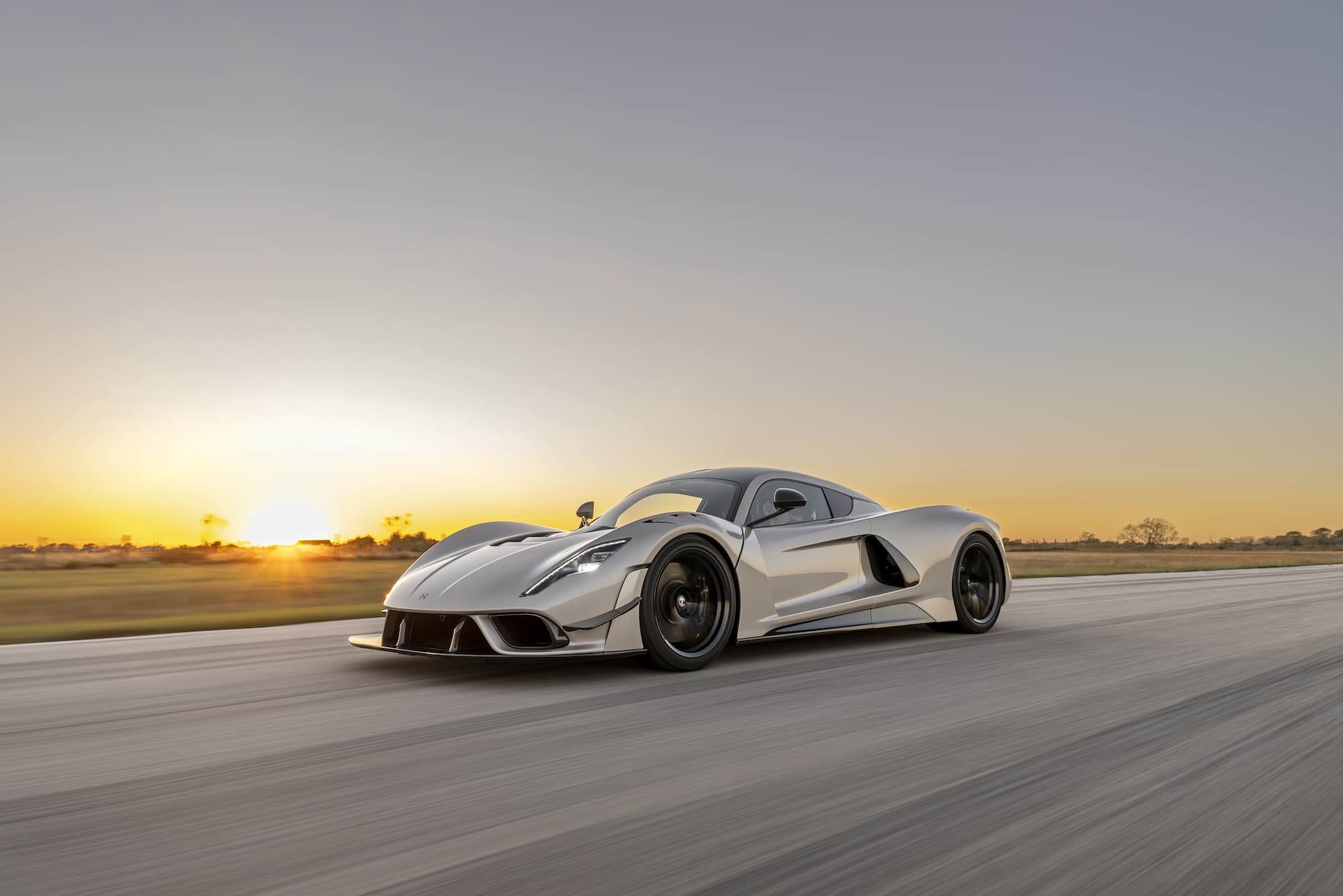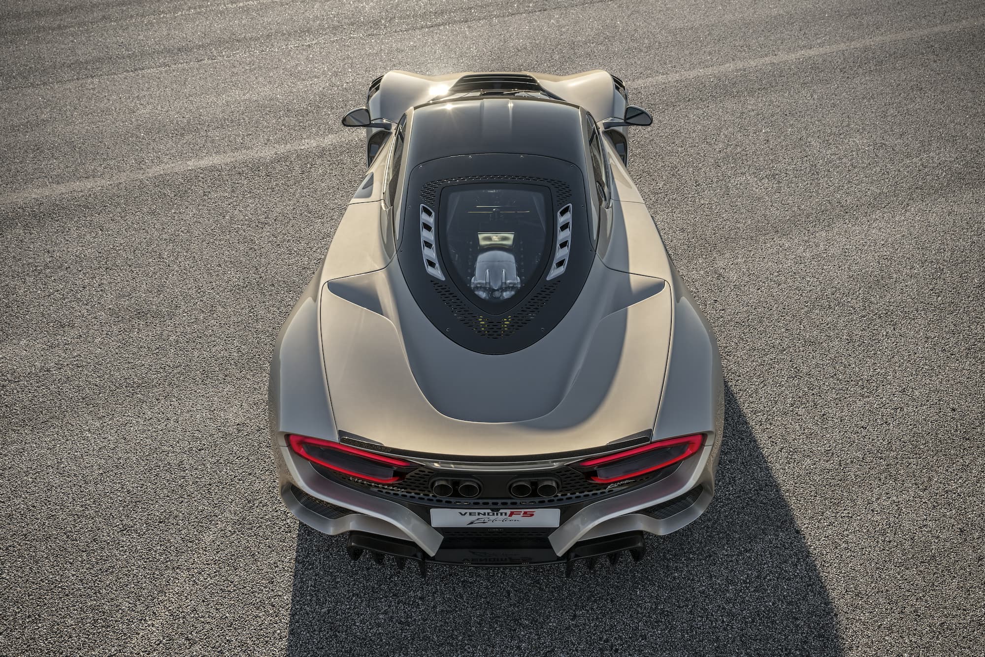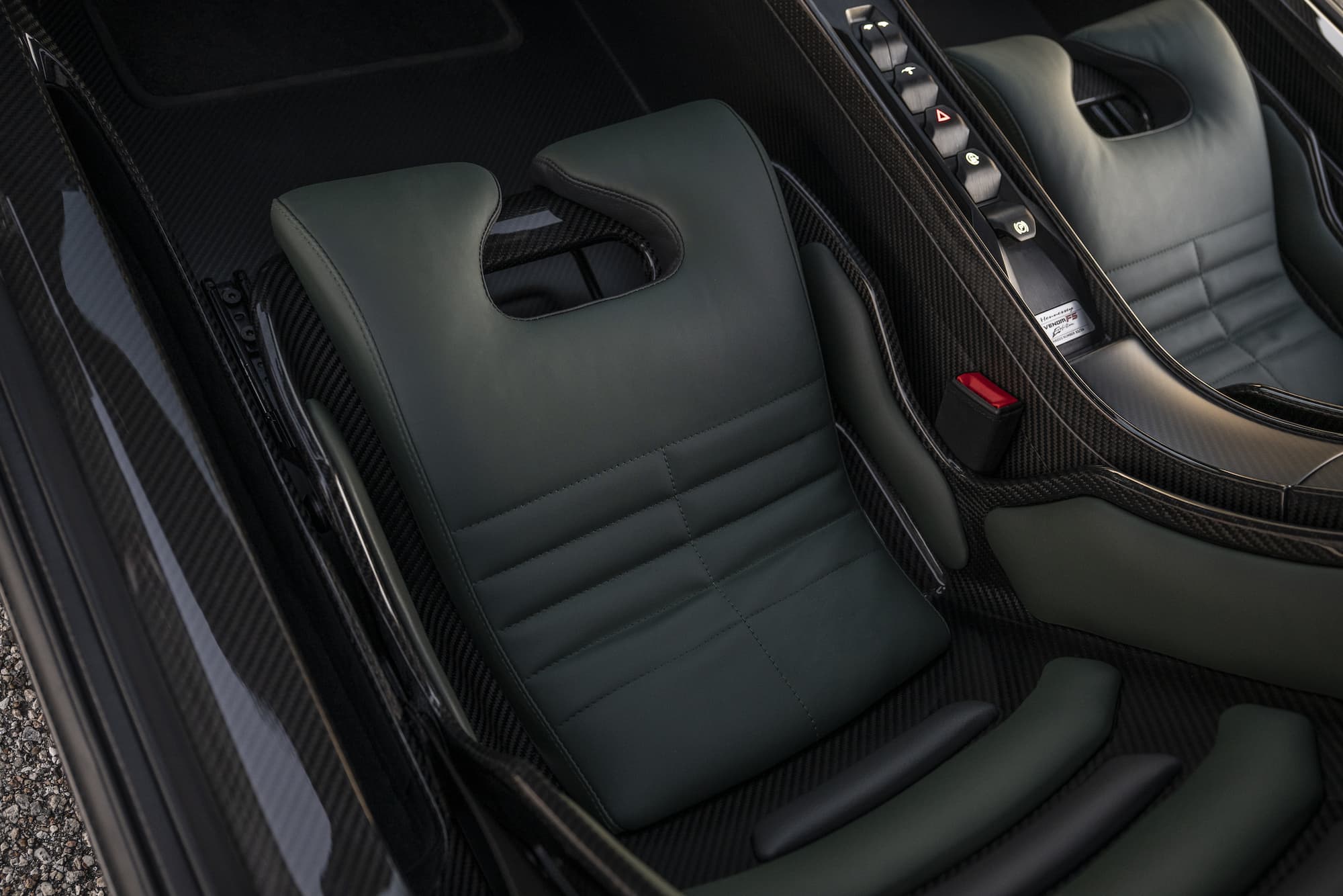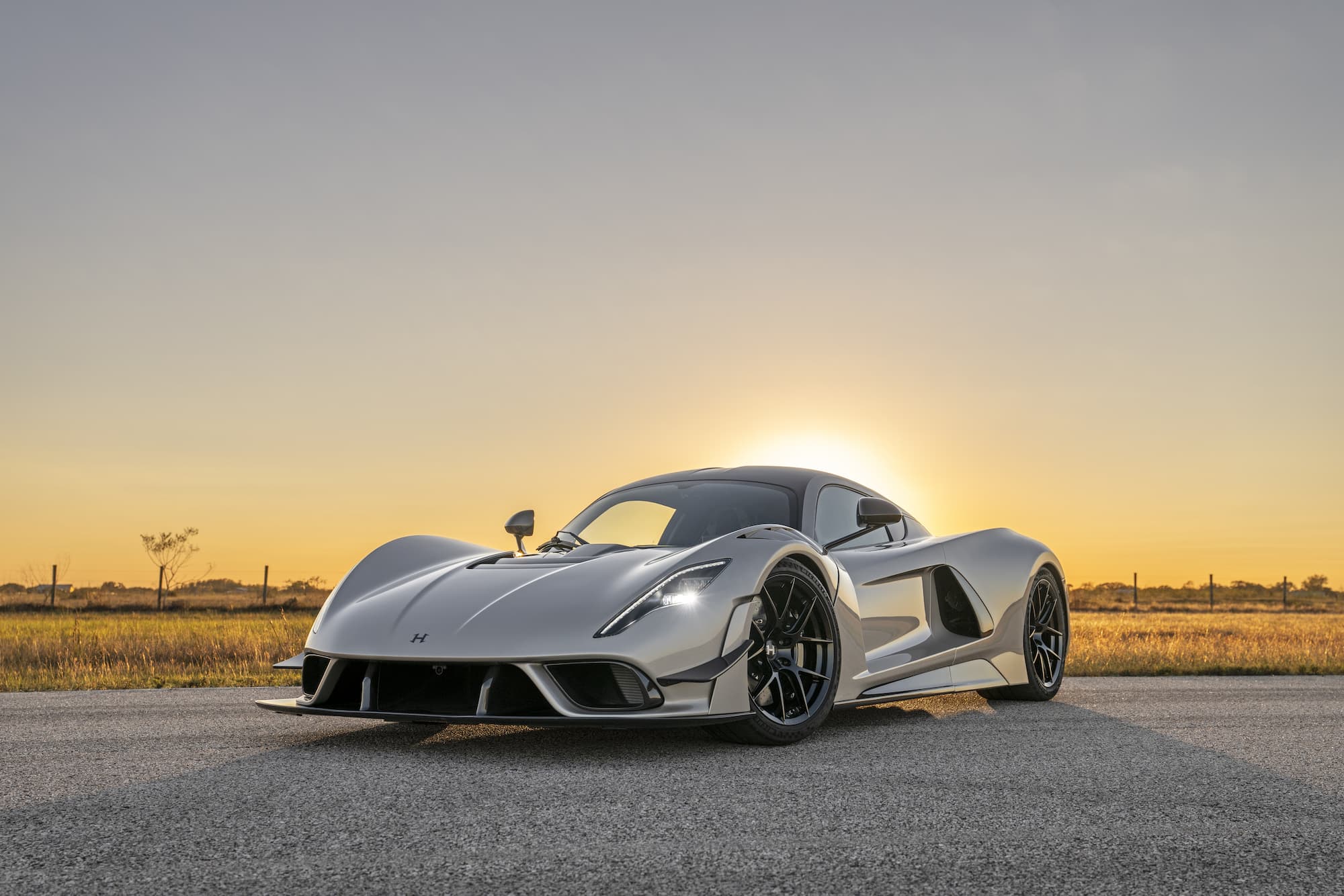 The bespoke Champagne Venom F5 coupe features a Gray exterior and Green-accented interior. This example of the F5 sports polished silver wheels and visible carbon fiber accents, and it has received the ‘Evolution’ upgrade.
