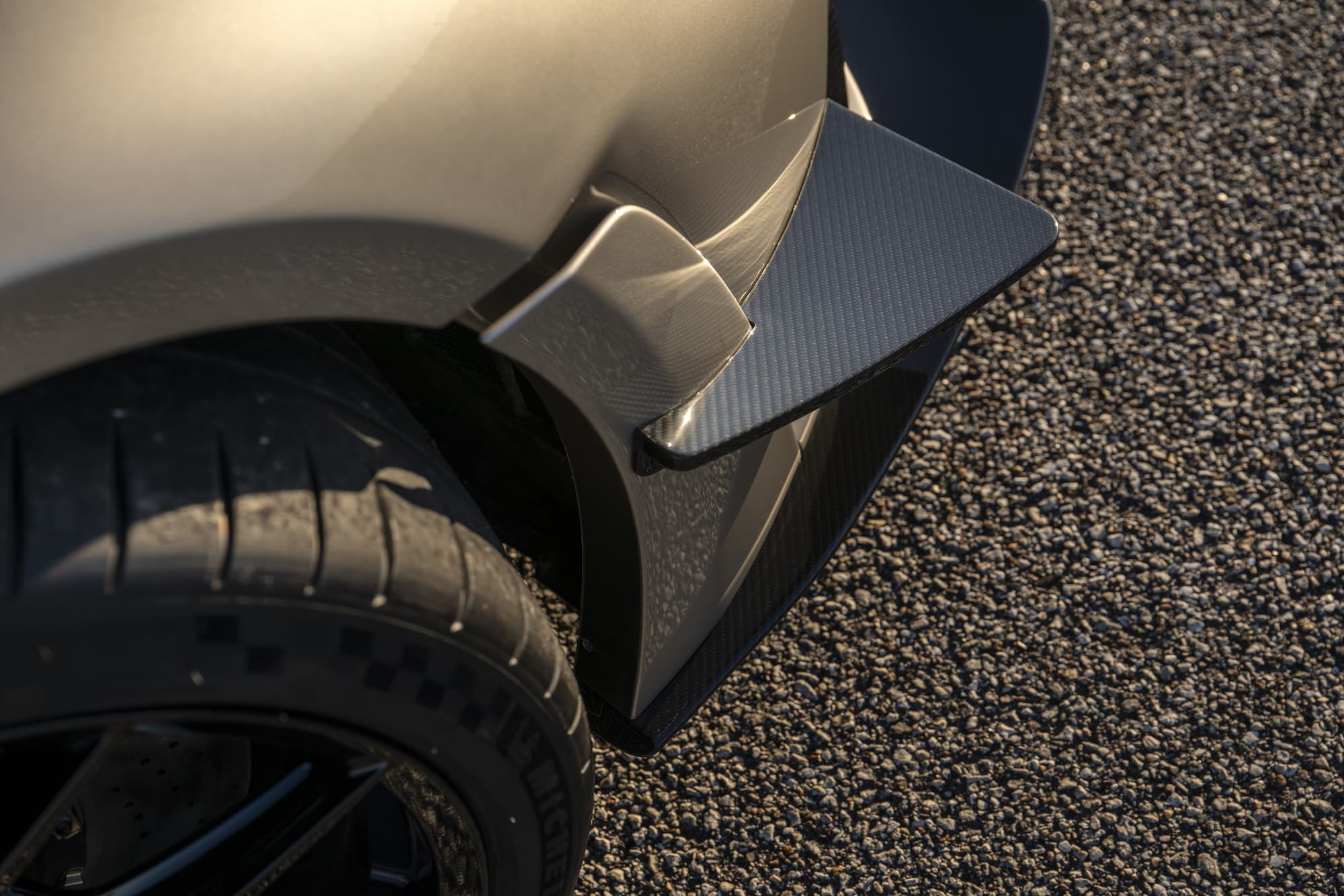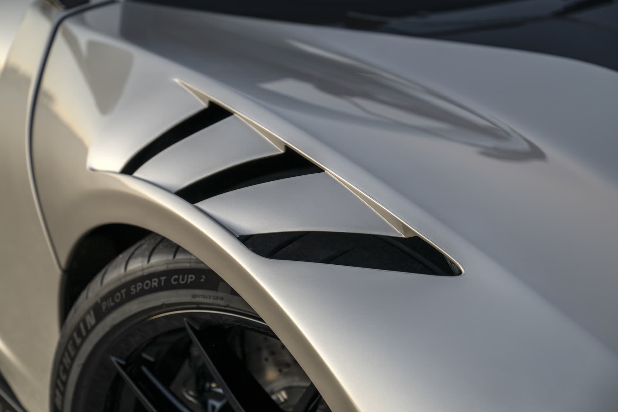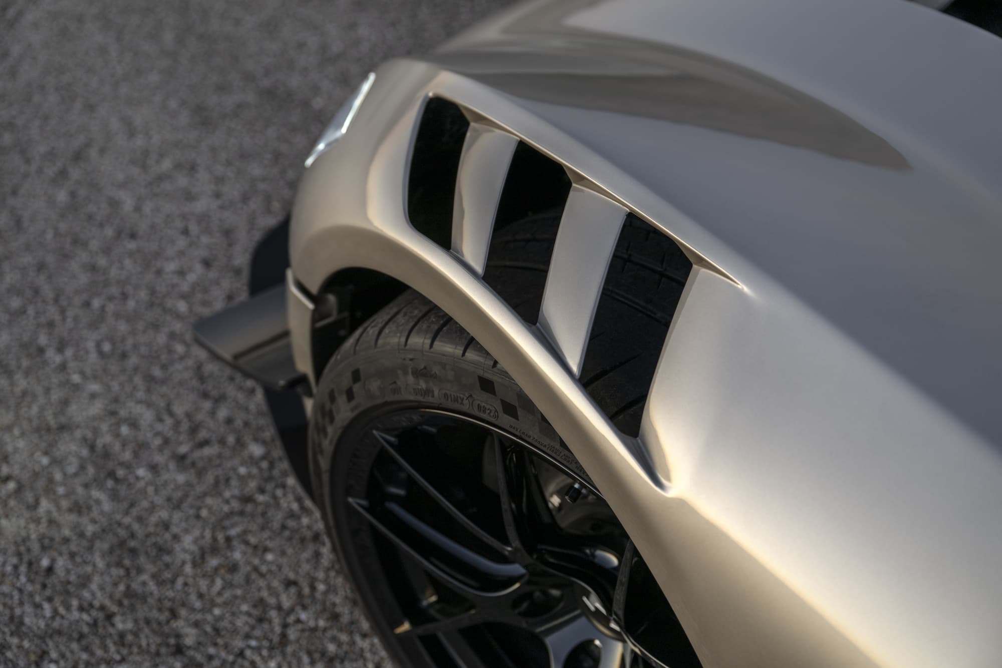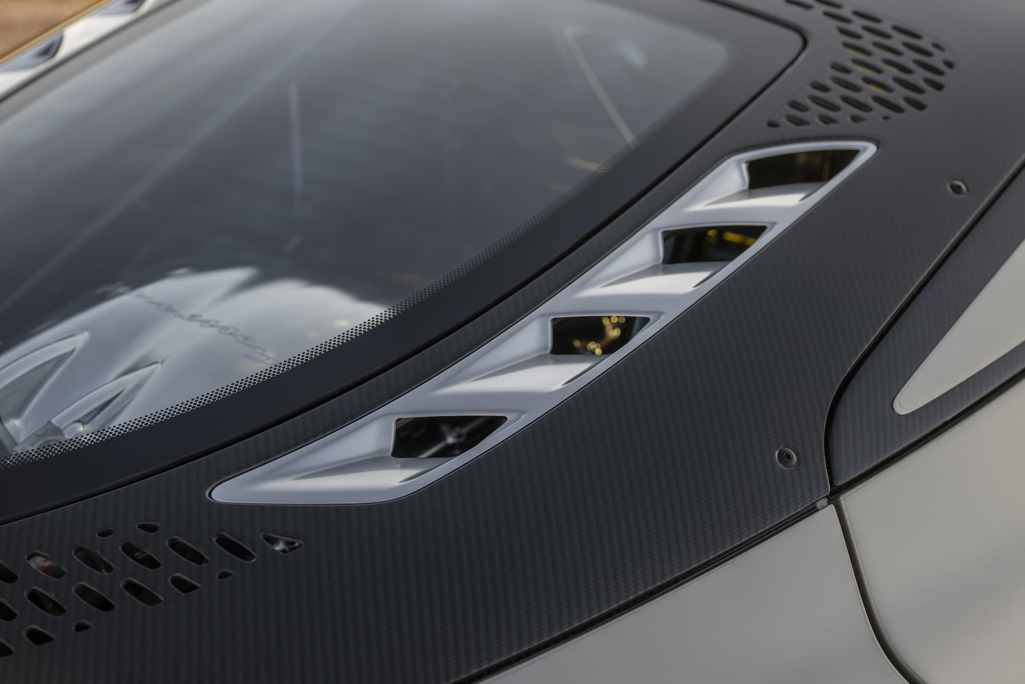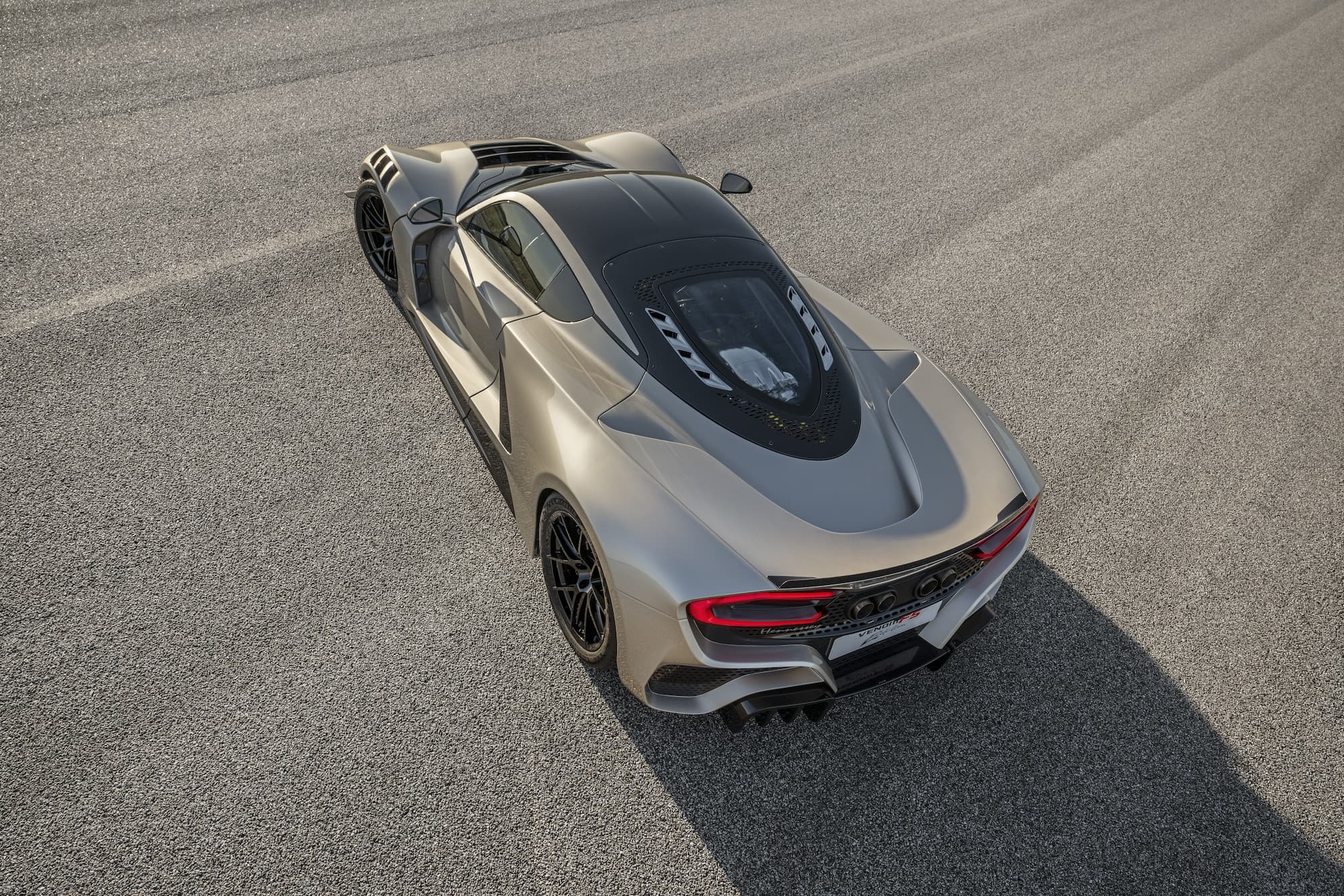 The bespoke Champagne Venom F5 coupe features a Gray exterior and Green-accented interior. This example of the F5 sports polished silver wheels and visible carbon fiber accents, and it has received the ‘Evolution’ upgrade.