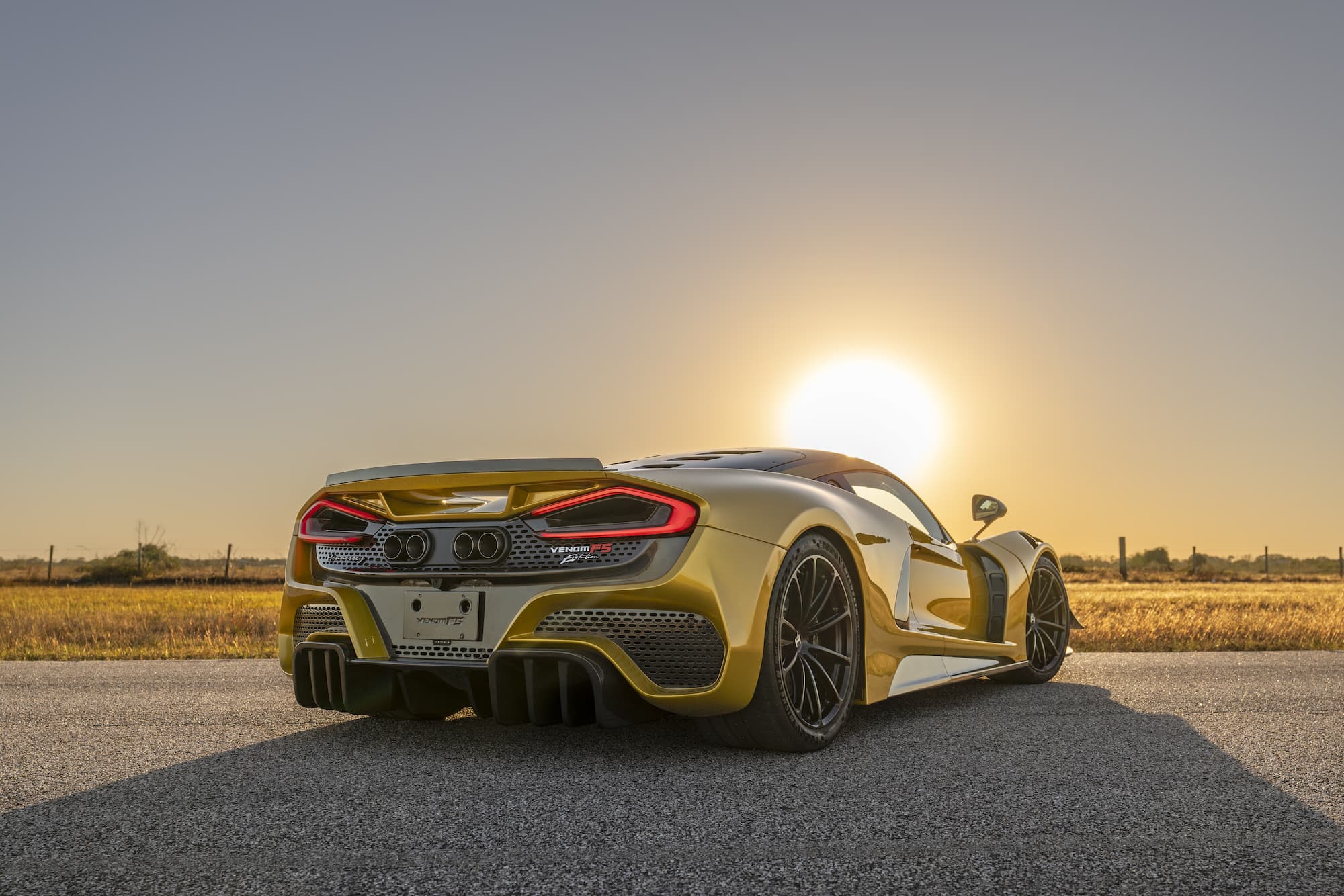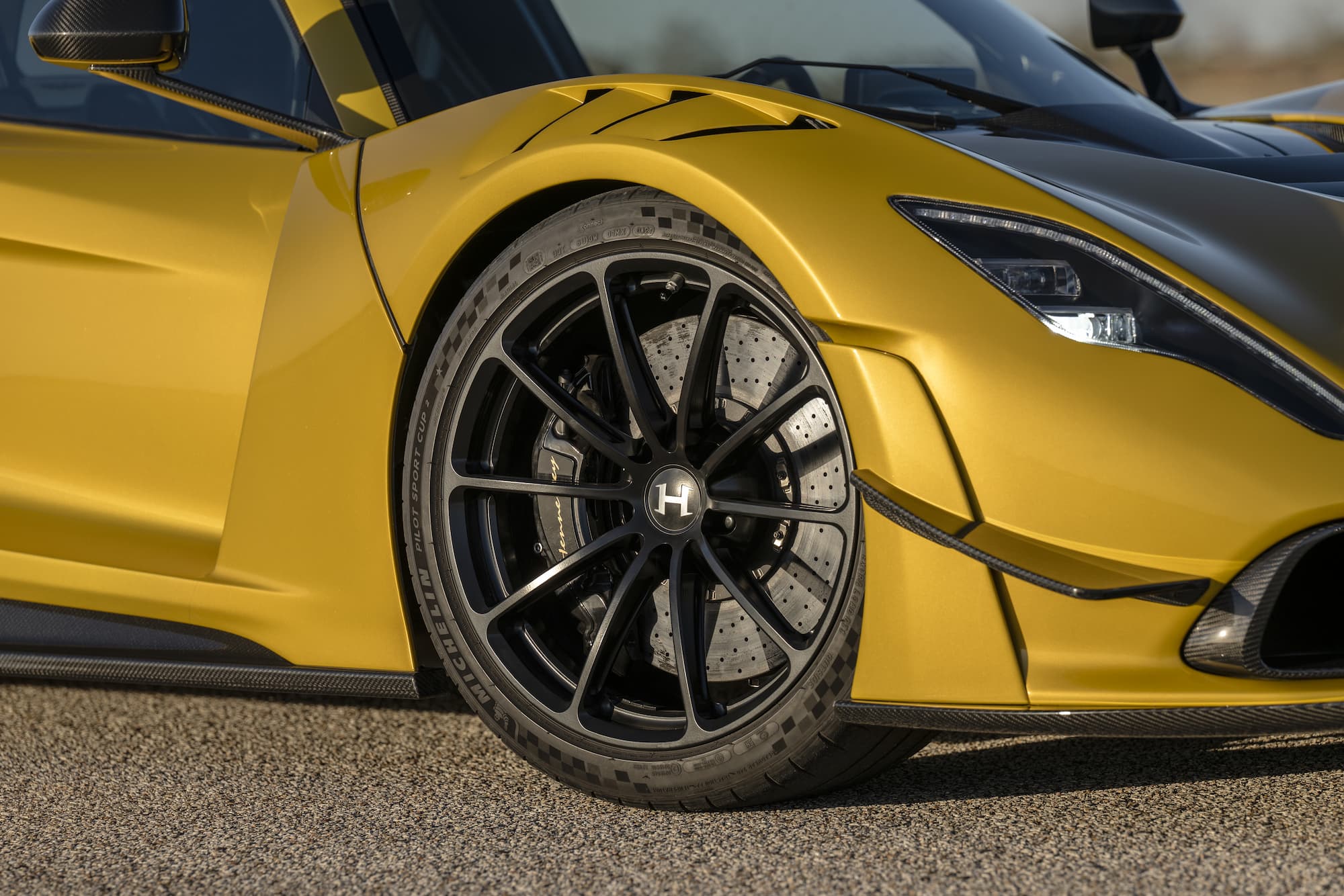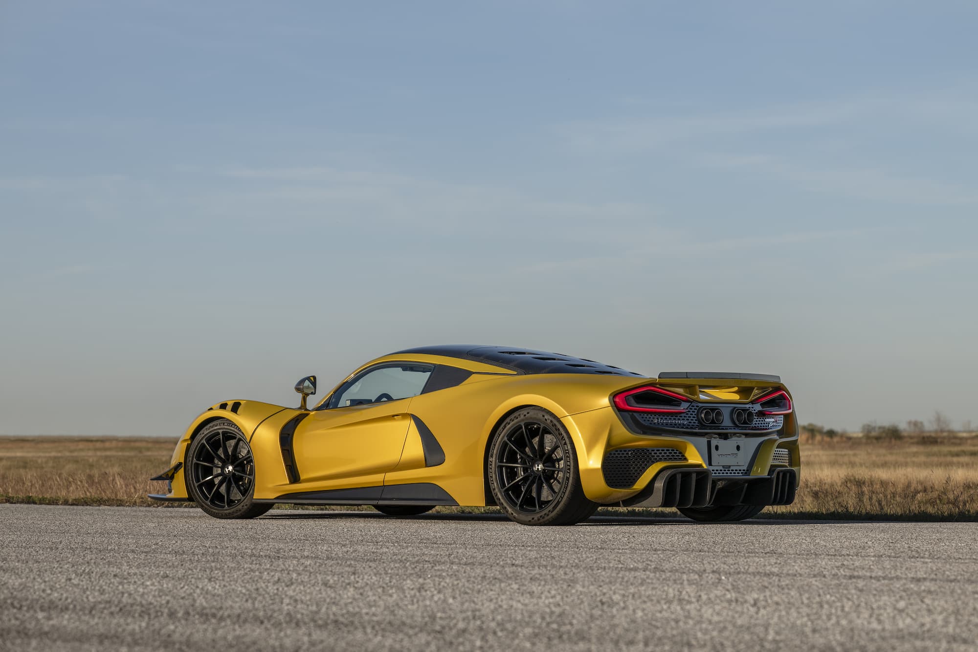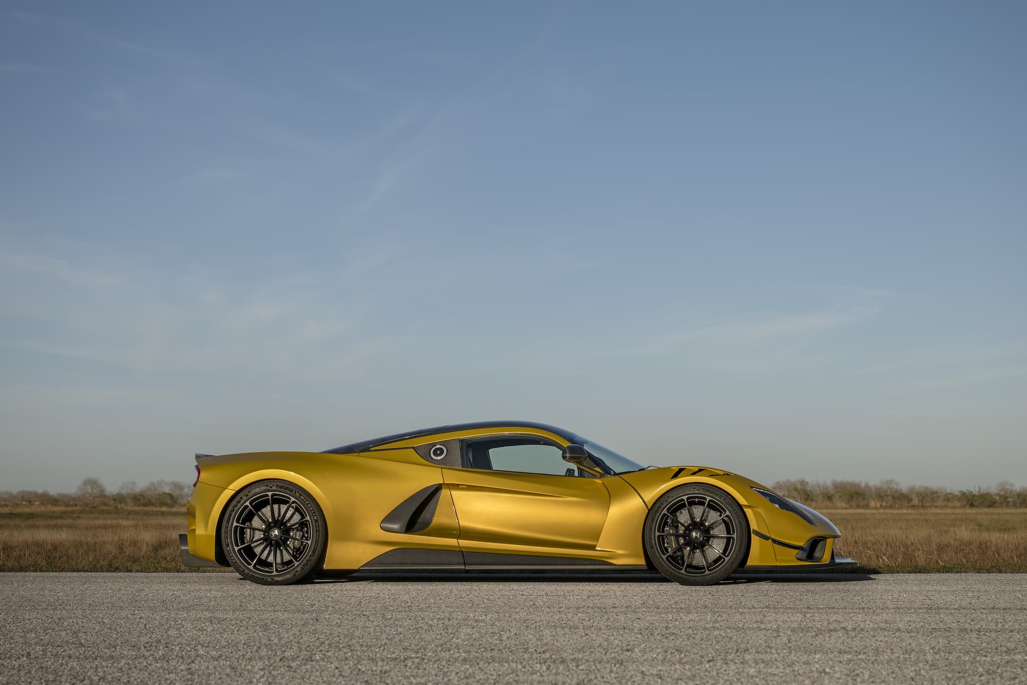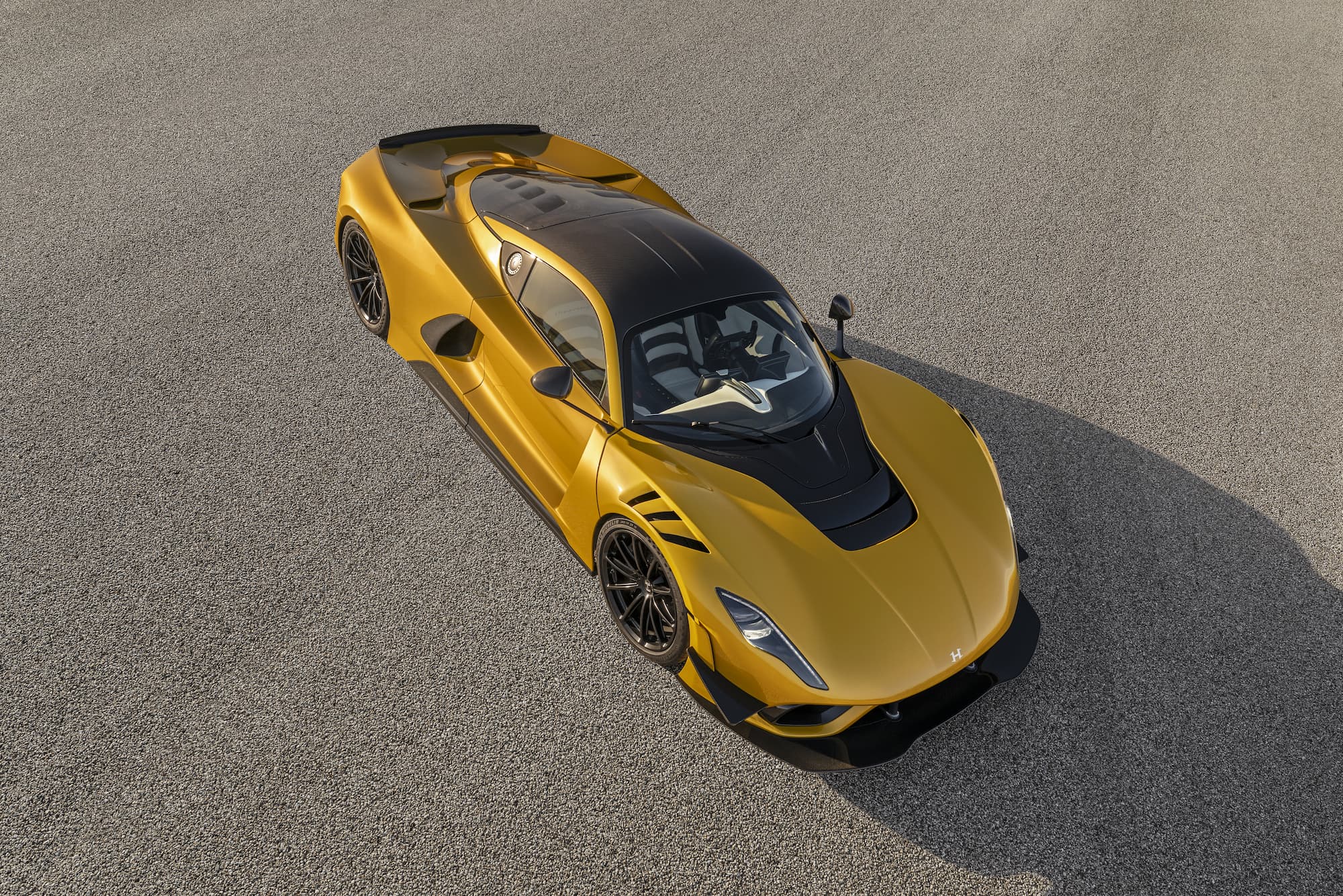 The bespoke Mojave Gold Venom F5 Coupe features a black and white-accented interior, upgraded with the ‘Evolution’ package. This example of the F5 sports anodized black wheels and visible carbon fiber accents.