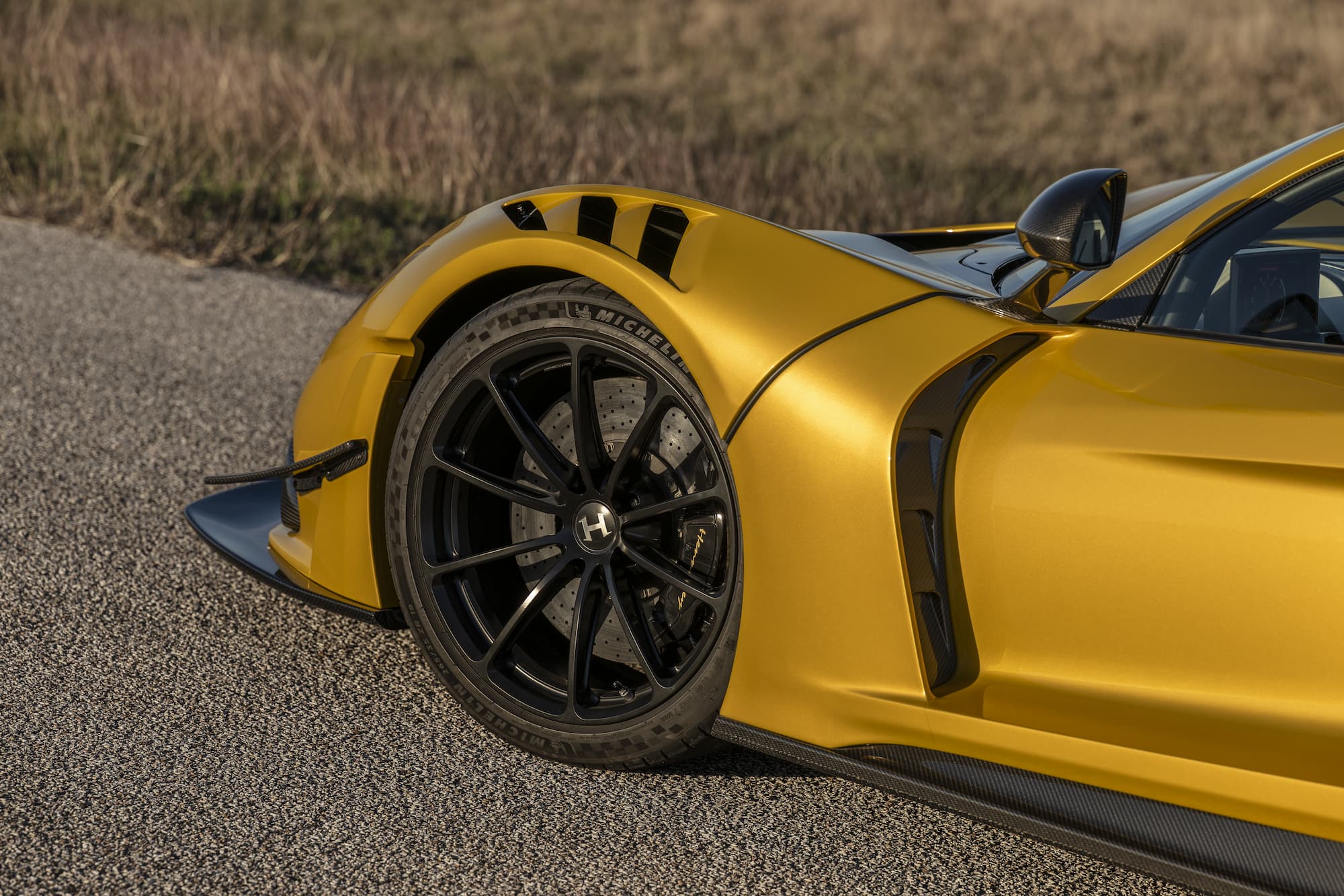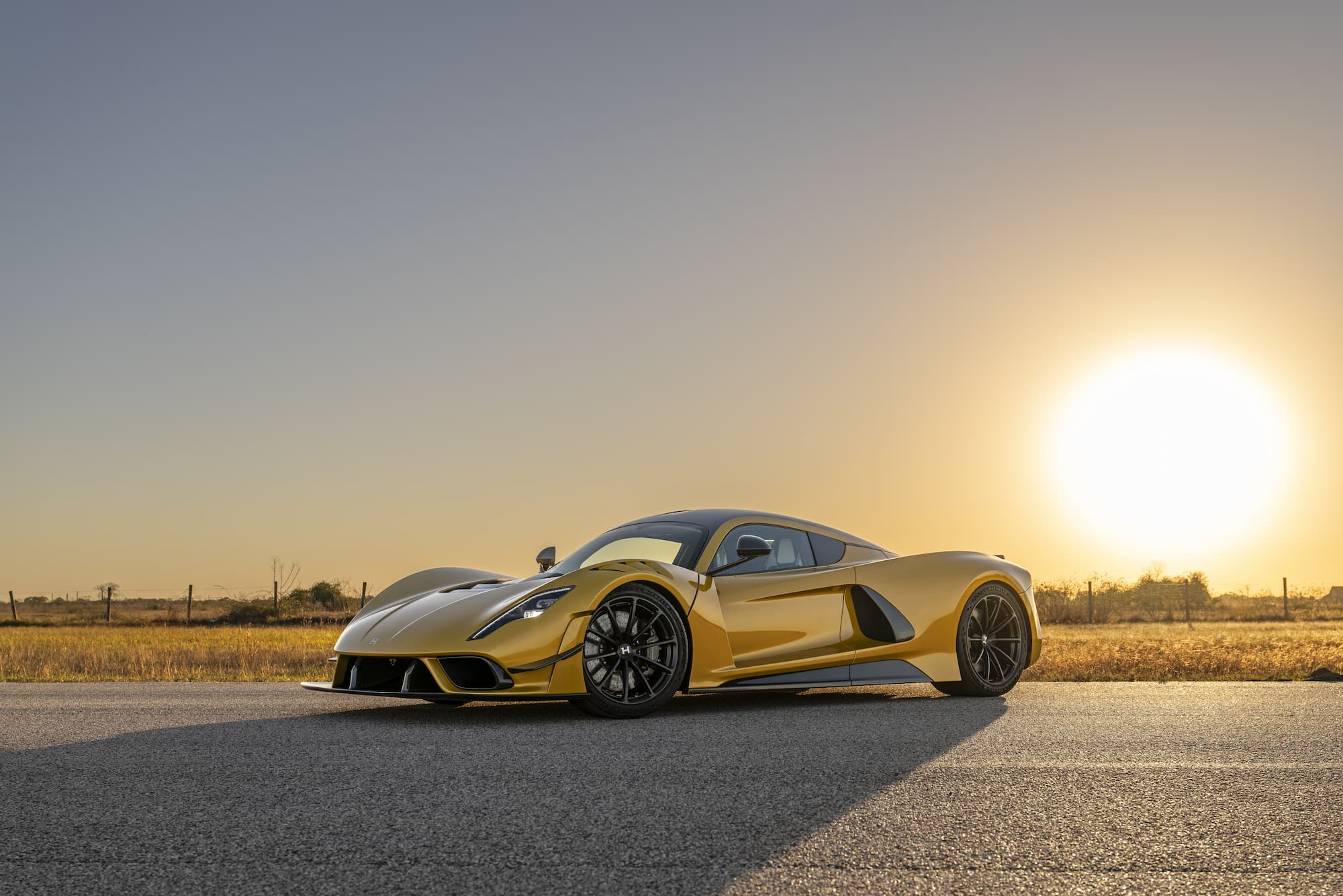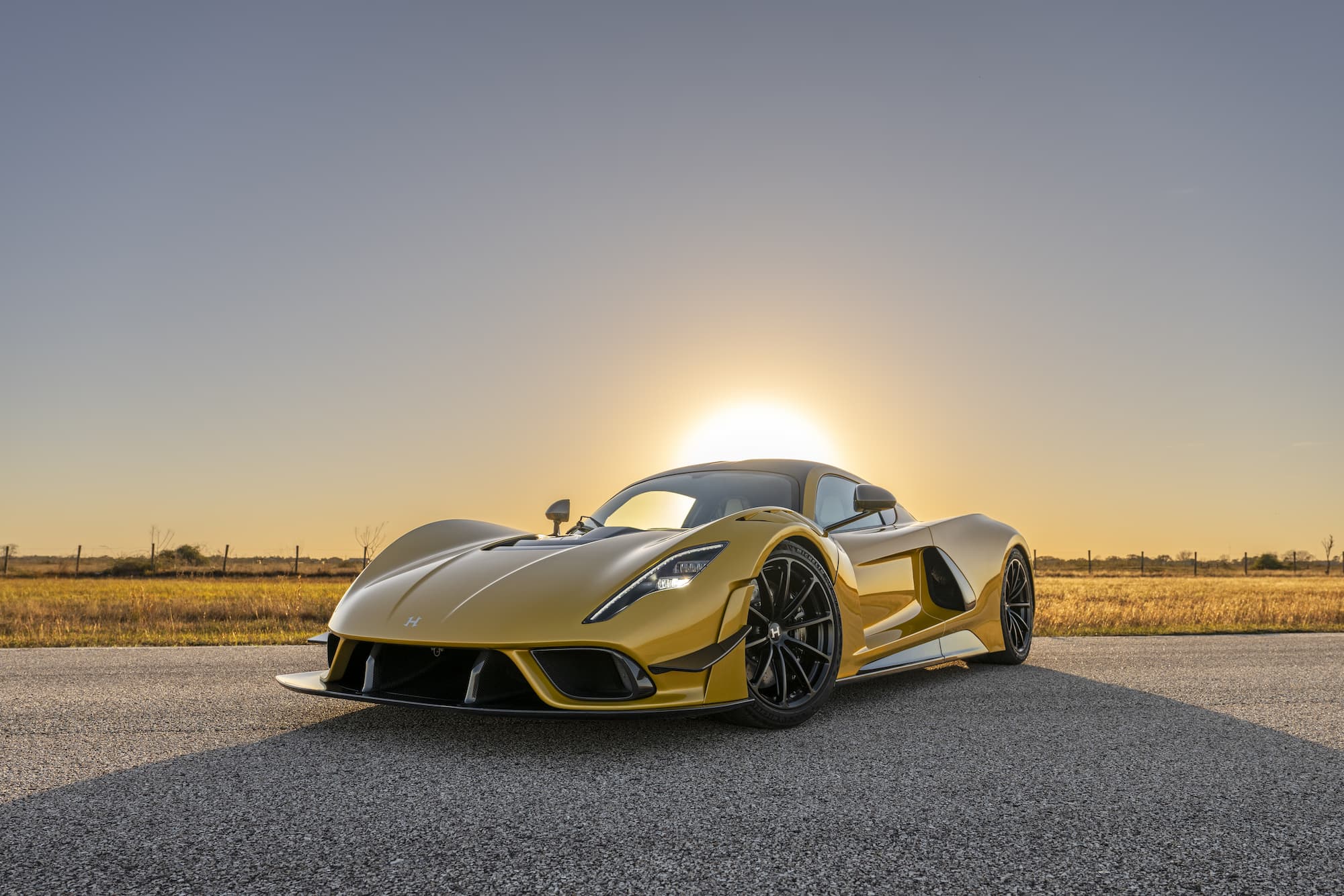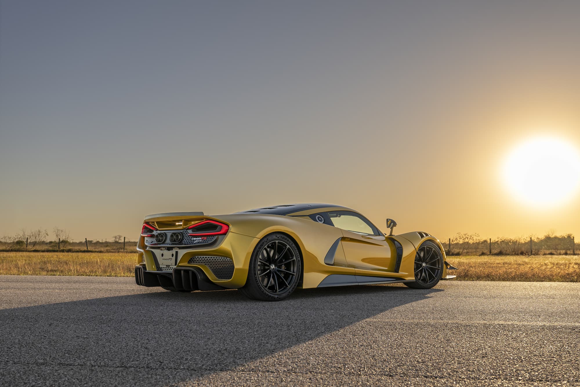 The bespoke Mojave Gold Venom F5 Coupe features a black and white-accented interior, upgraded with the ‘Evolution’ package. This example of the F5 sports anodized black wheels and visible carbon fiber accents.