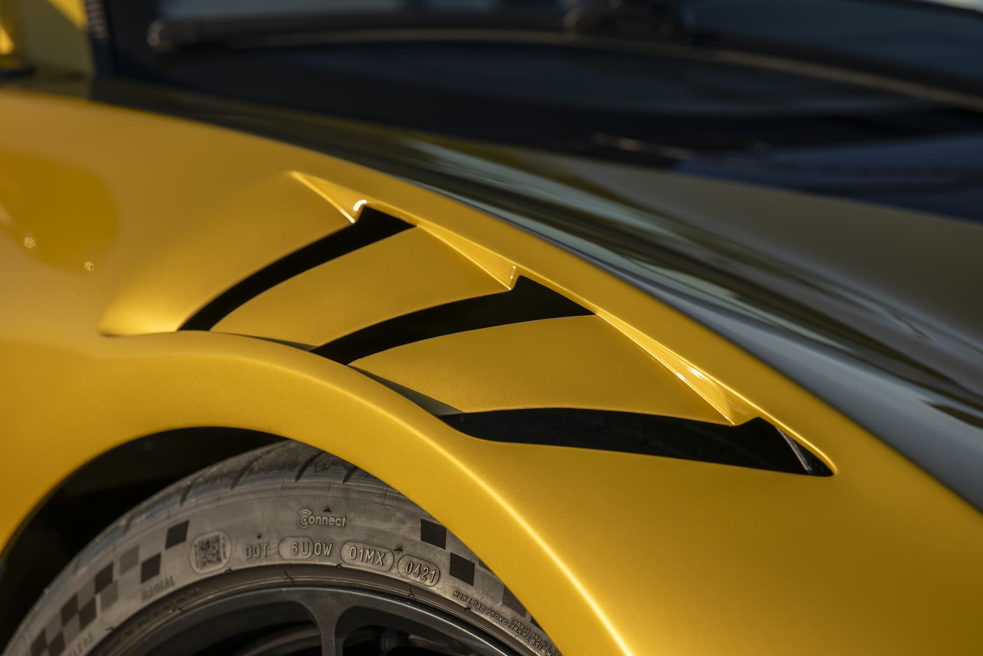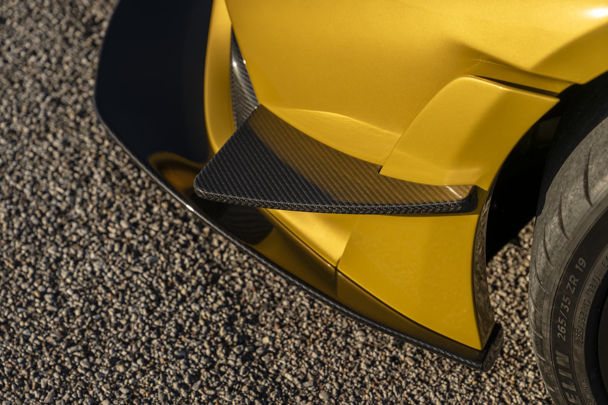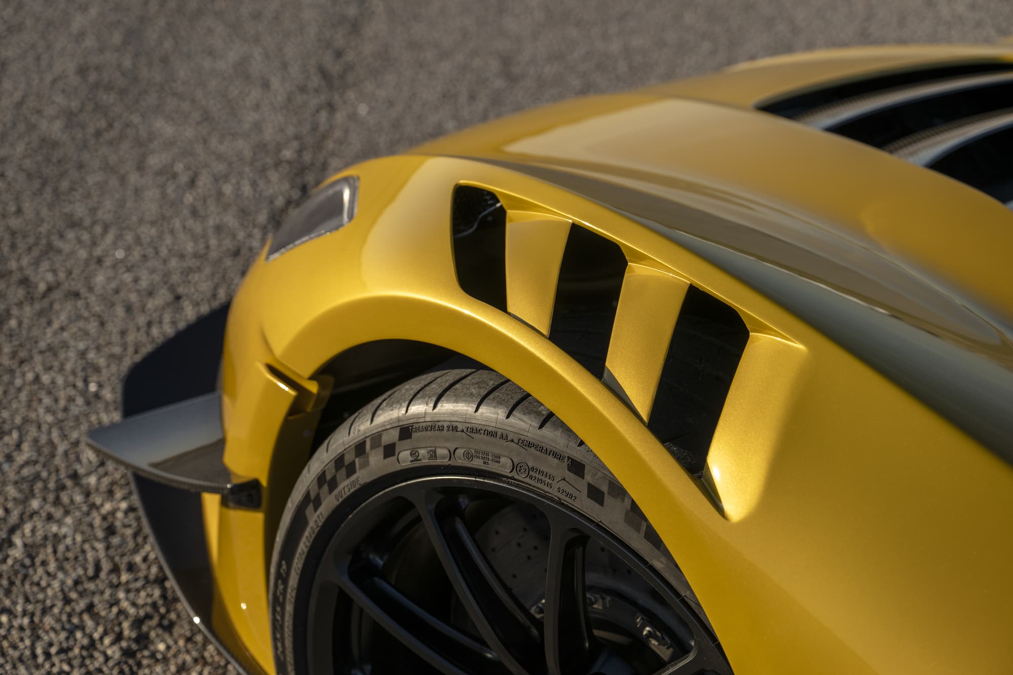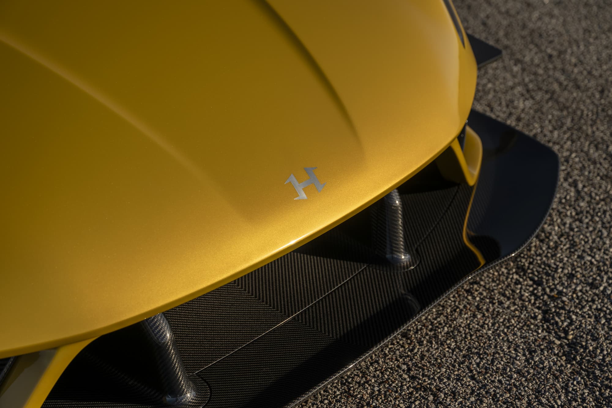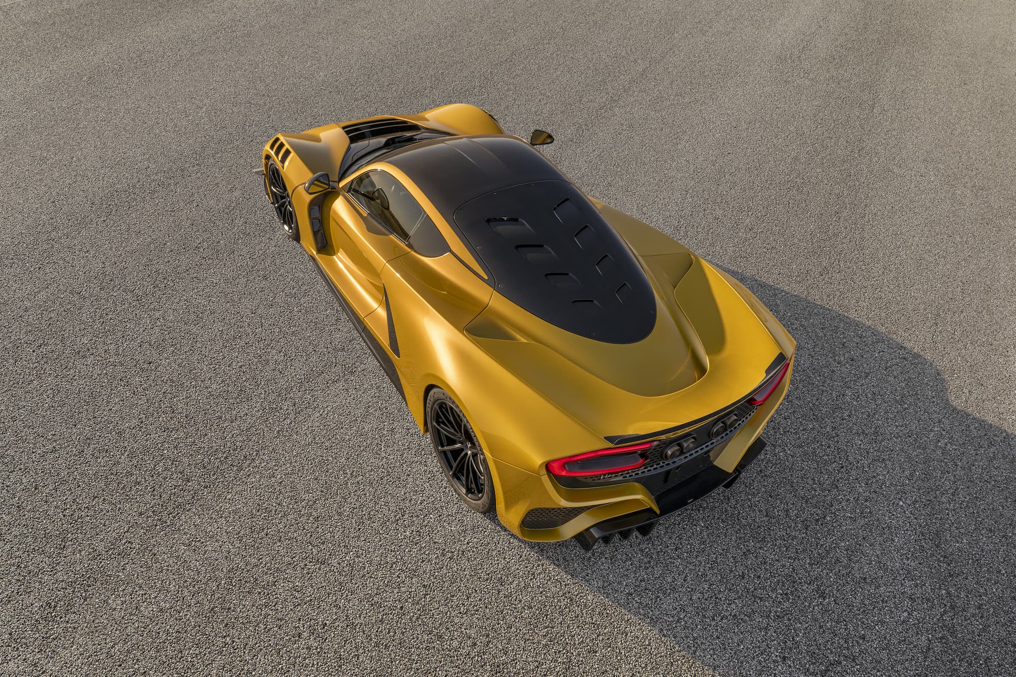 The bespoke Mojave Gold Venom F5 Coupe features a black and white-accented interior, upgraded with the ‘Evolution’ package. This example of the F5 sports anodized black wheels and visible carbon fiber accents.