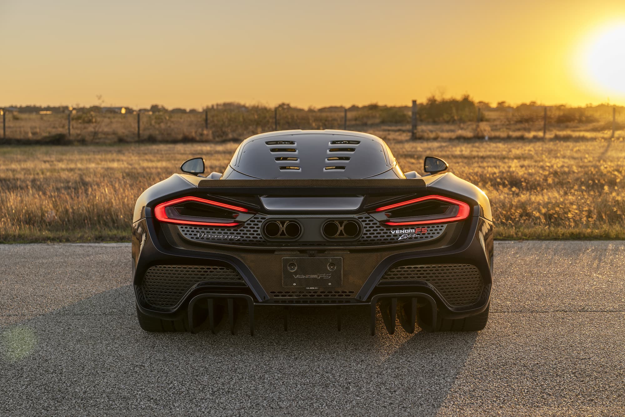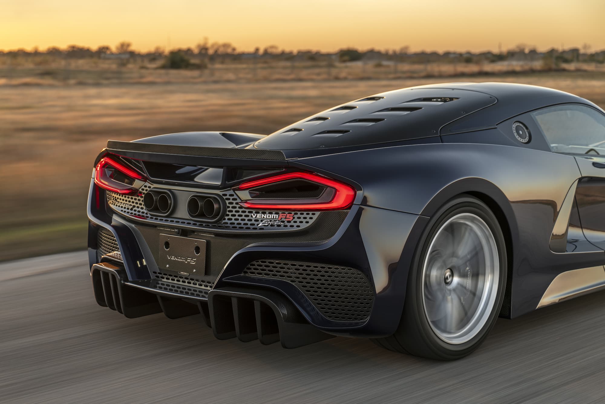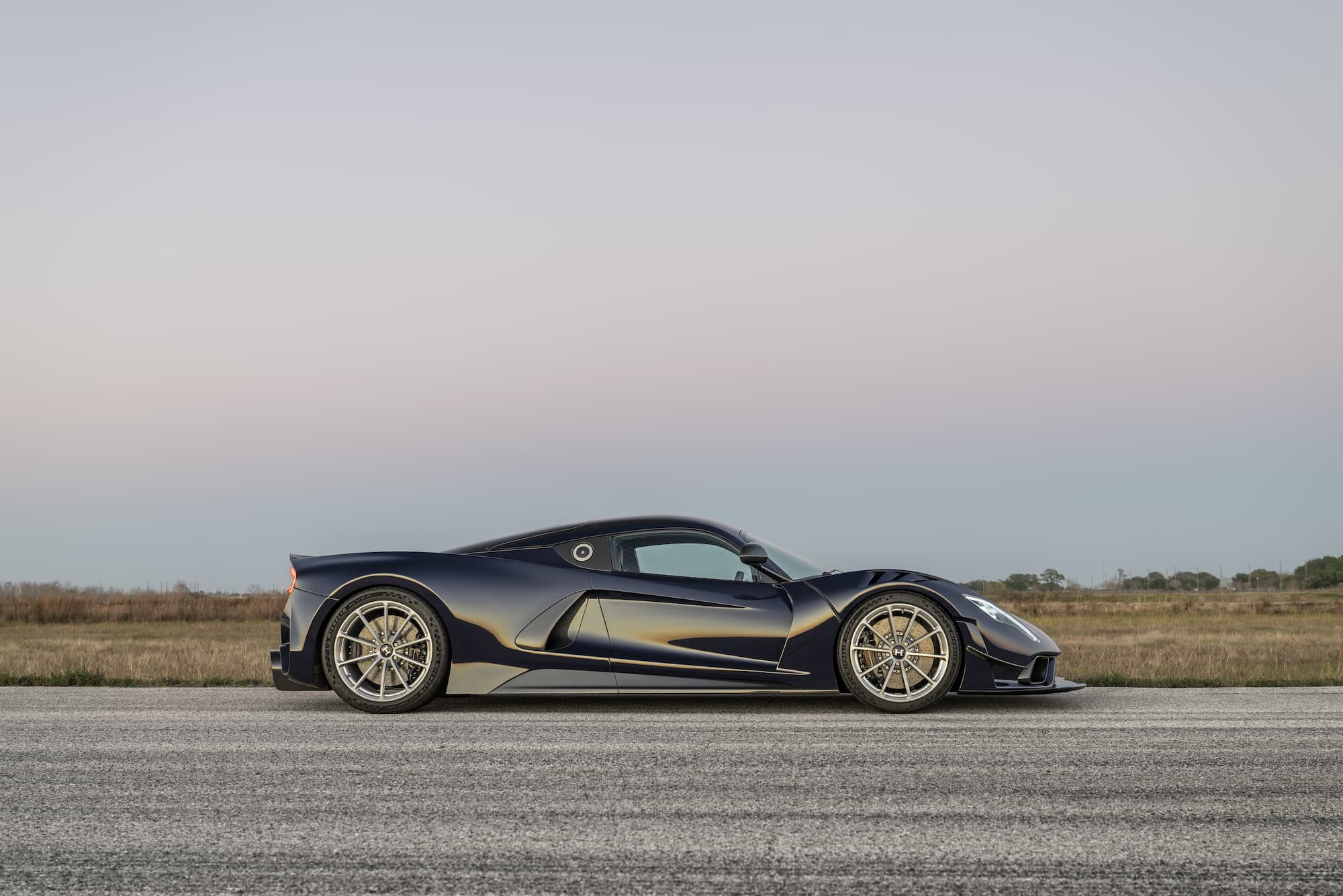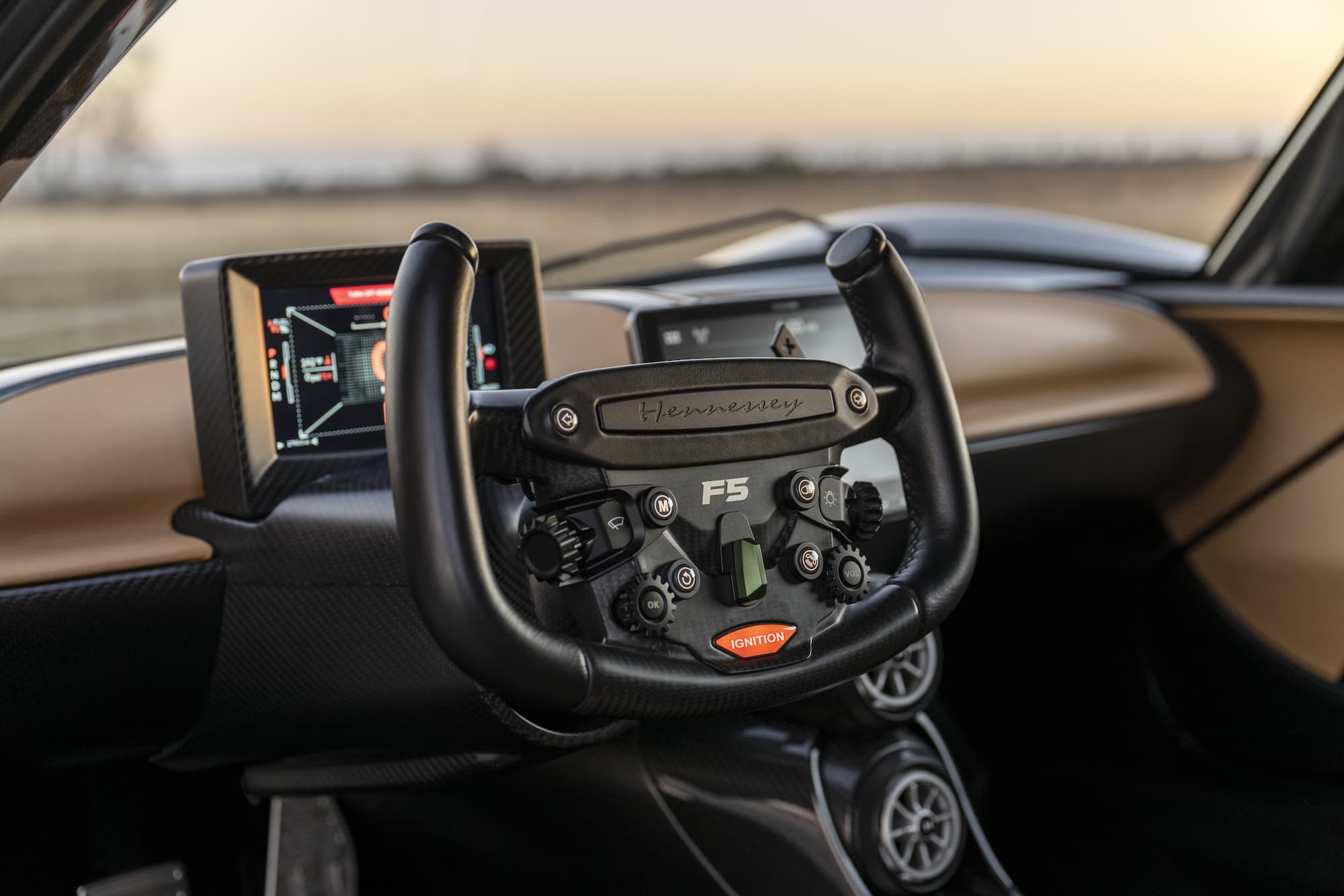 The bespoke Speed Devil Blue Venom F5 coupe features a Butterscotch Tan and Black-accented interior. This example of the F5 sports polished silver wheels and visible carbon fiber accents, and it has received the ‘Evolution’ upgrade.