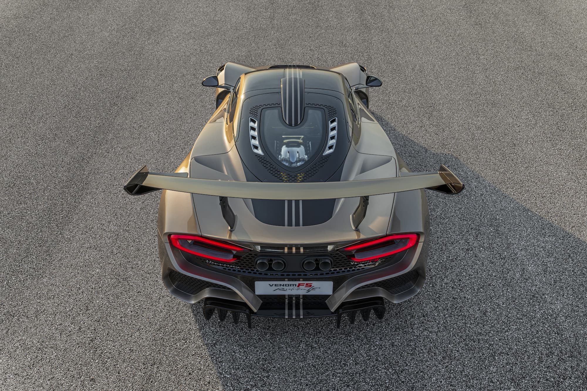 Featuring an all-new carbon fiber tub, the commission pairs Hennessey’s latest Evolution package with an open-top F5 in track-spec ‘Revolution’ configuration. The design is based on the already exclusive ‘Stealth Series’, which sees exposed carbon fiber flow from nose to tail, broadening to envelop the cockpit before narrowing again beneath the 290 mm-high rear wing. Tinting the carbon fiber Coco Brown, opting for brilliant River Sand Metallic paint – the color of rich champagne, and adding a body-color tri-stripe, then specifying a six-speed gated manual transmission, instantly makes this the most unique and complex F5 to-date.